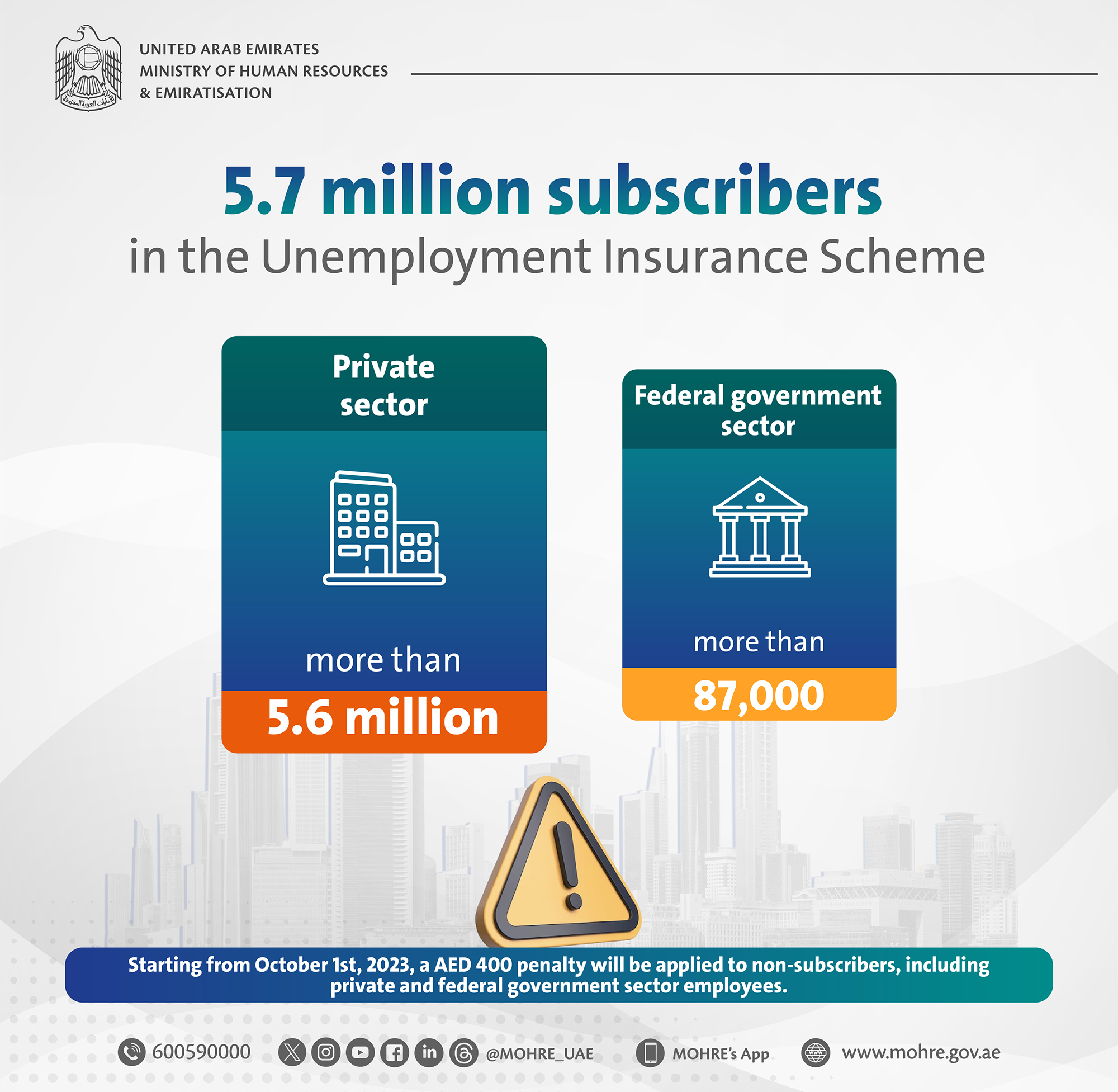 The Ministry of Human Resources and Emiratisation (MoHRE) revealed that approximately 5.73 million employees have subscribed to the Unemployment Insurance Scheme since it went into effect on 1 January 2023, up until 25 September Including more than 5.6 million subscribers in the private sector and more than 87 thousand subscribers in the federal government sector.