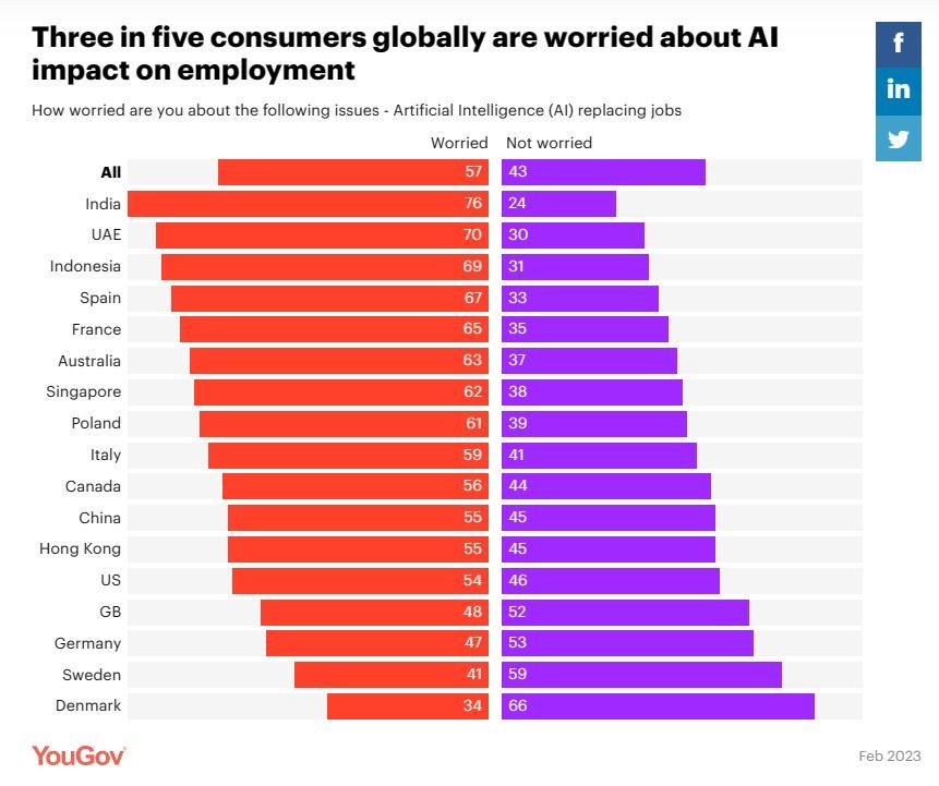 A recent survey conducted by YouGov across 18 countries sheds light on consumers' perceptions and concerns regarding the potential impact of AI on employment.