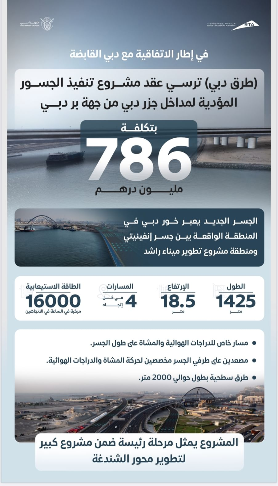 Mattar Al Tayer, Director-General and Chairman of the Board of Executive Directors of RTA, highlighted that the project also includes a dedicated pedestrian and cycling path with elevators, as well as 2,000 metres of connecting roads on both the Dubai Islands and Bur Dubai sides.