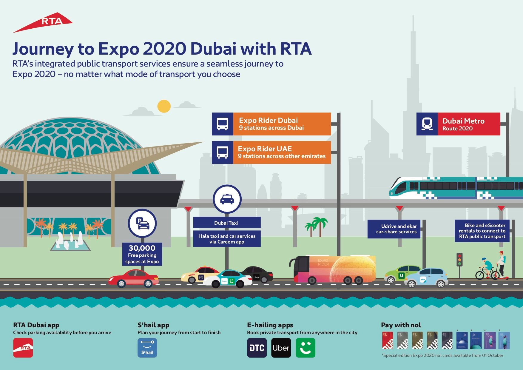 RTA is deploying 15,000 taxis and limousines to serve the emirate and visitors to Expo 2020. They include 9,710 taxis and 5,681 limousines, which can be booked through the e-hail services of Uber and Careem. RTA added 10 vehicles to serve people of determination at the Expo 2020 site.