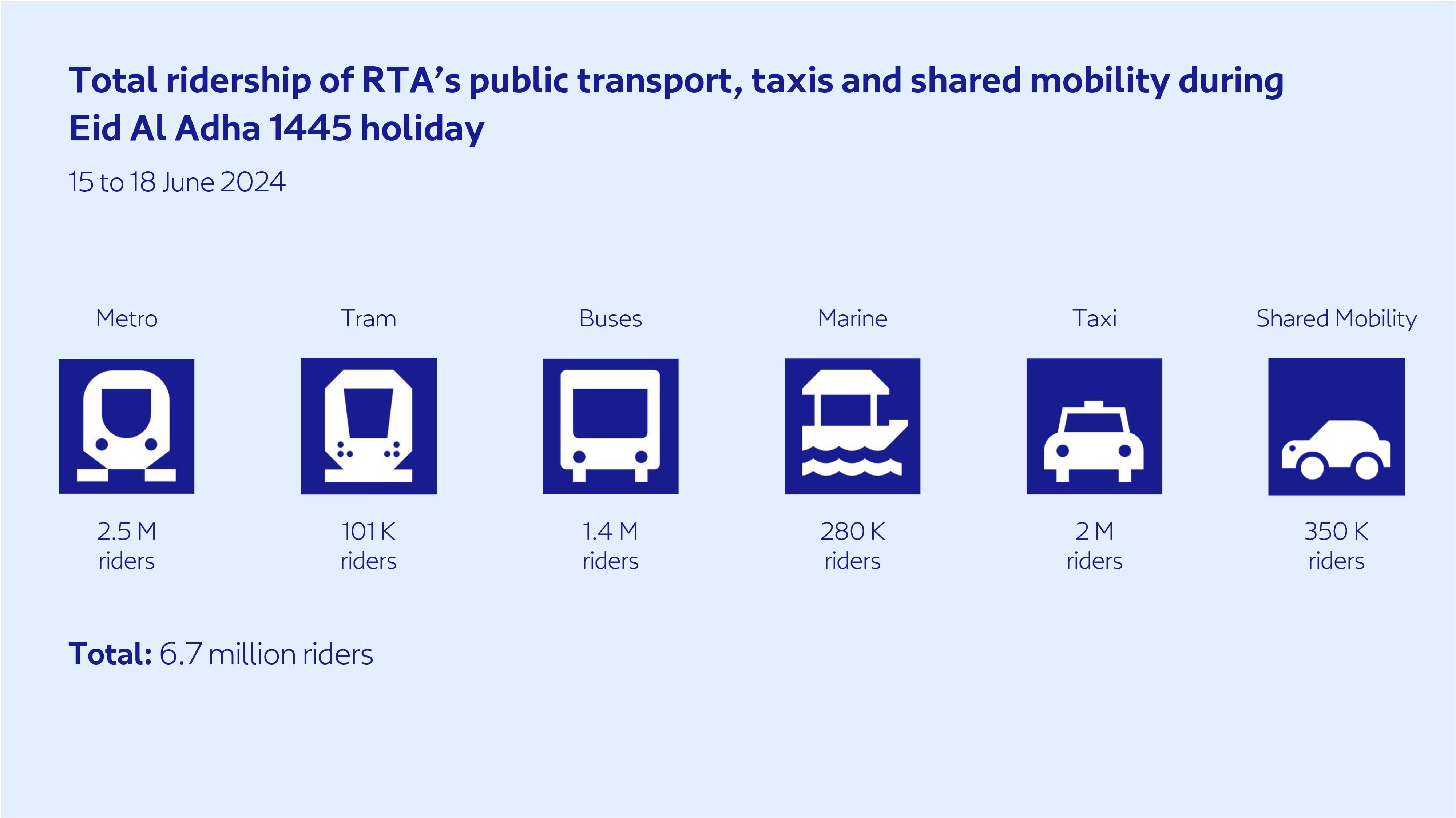 Dubai's Roads and Transport Authority (RTA) announced that during Eid Al Adha holiday, from June 15 to 18, 2024, the total number of passengers who used public transportation, shared transportation, and taxis exceeded 6.7 million compared to approximately 6.4 million riders during the same period last with.