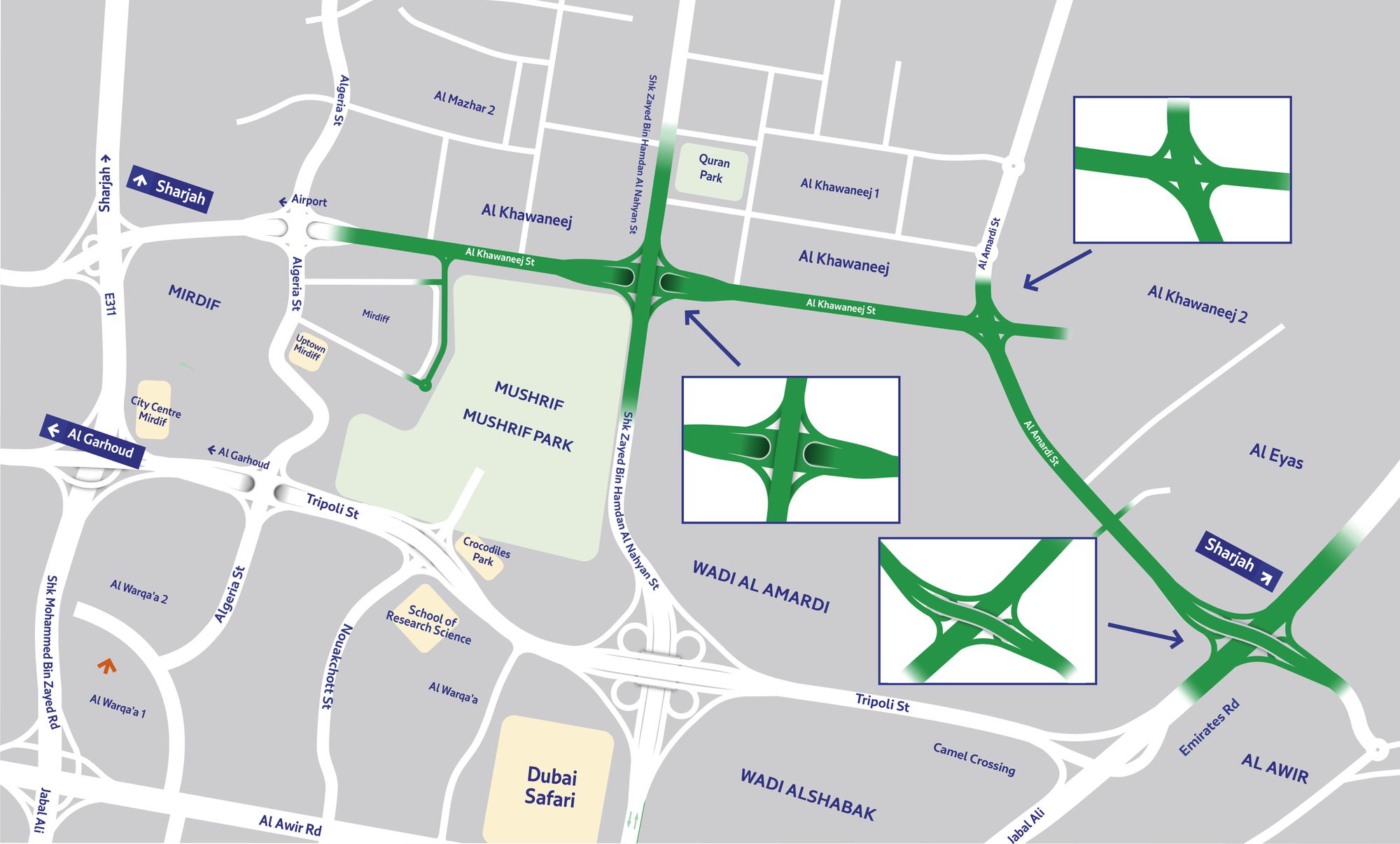 “The Improvement of Al Khawaneej Roads Project is one of the key strategic projects for improving the links between Dubai and Sharjah through the improvement of vertical roads linking with the Emirates Road and Sheikh Mohammed bin Zayed Road up to the Airport Street.”