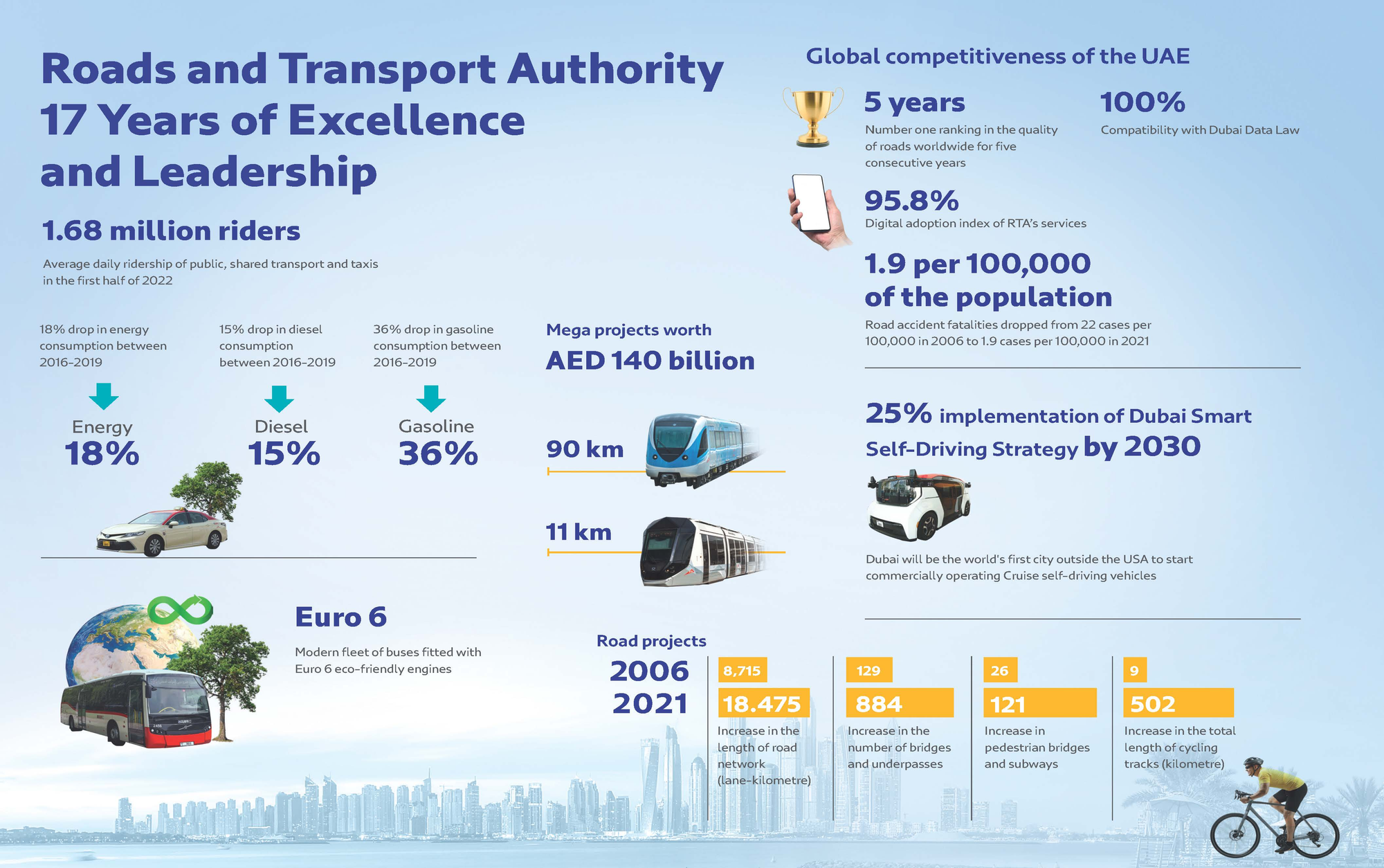 “The projects implemented by RTA have enhanced the global competitiveness of the United Arab Emirates which was ranked Number One in the quality of road worldwide for 5 consecutive years. The concerted efforts of RTA and the Dubai Police General HQ have helped improve road accident-related fatalities from 22 cases per 100,000 of the population in 2006 to only 1.9 cases in 2021’’