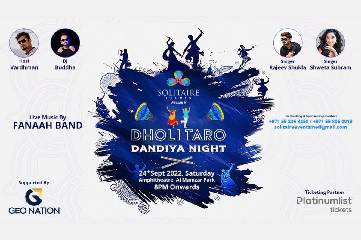 Solitaire Events presents a wholesome night of family musical entertainment with the “Dholi Taro Dandiya Night 2022” Get ready to play and dance on the live music by Fannah band along with renowned and talented singers like Rajeev Shukla and Shweta Shubham who got fame from the famous song Jalebi. There is also the International famous DJ Buddha who will perform non-stop Bollywood remixes. This event will be hosted by RJ Vardhman and will be a phenomenal night filled with rocking Bollywood music, traditional dandiya, garba tunes and delicious delicacies from a variety of Multi cuisine food stalls. You can also win lots of prizes as best dancers, Traditional dress and many more. This is one fun night you don’t want to miss.