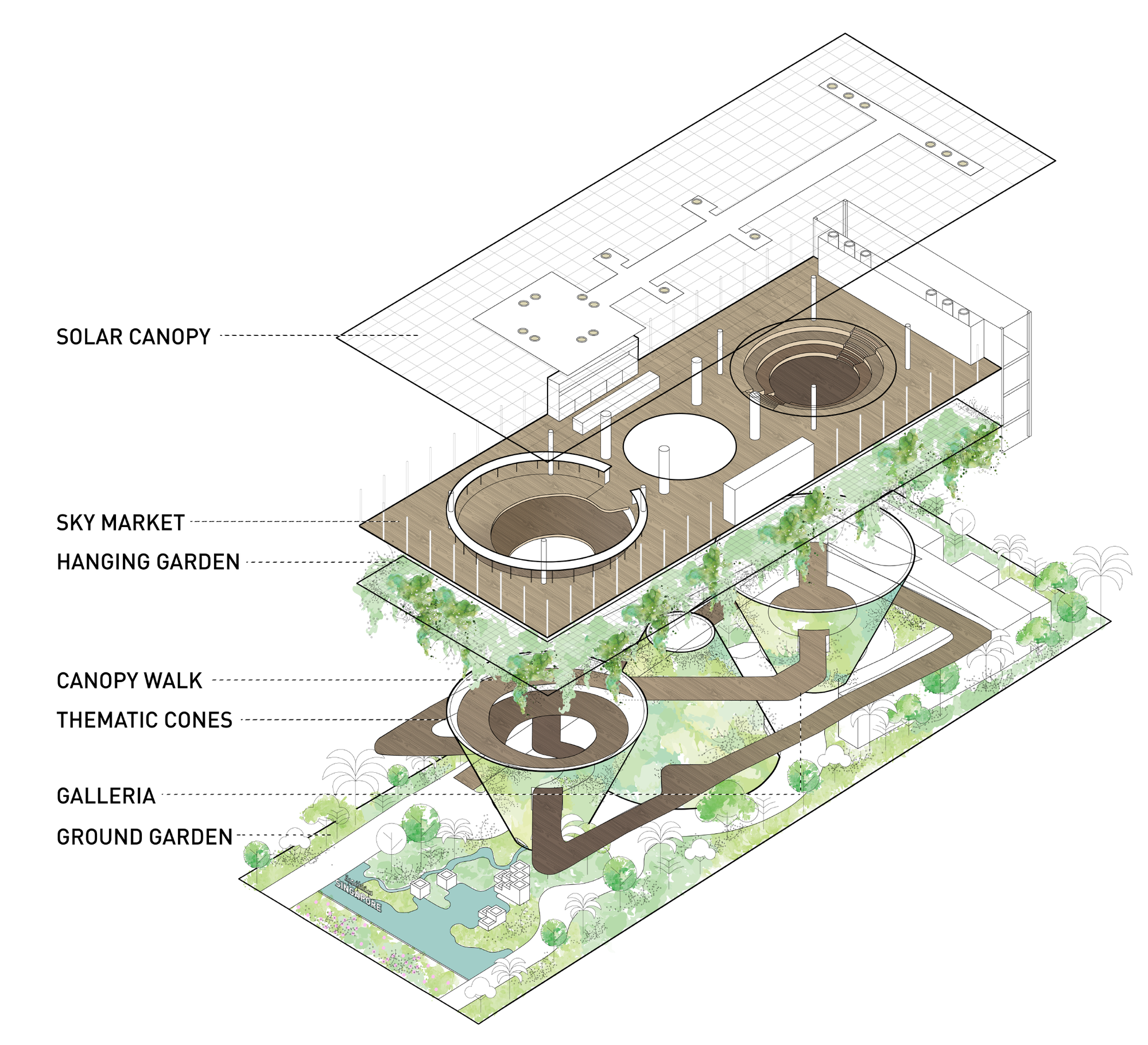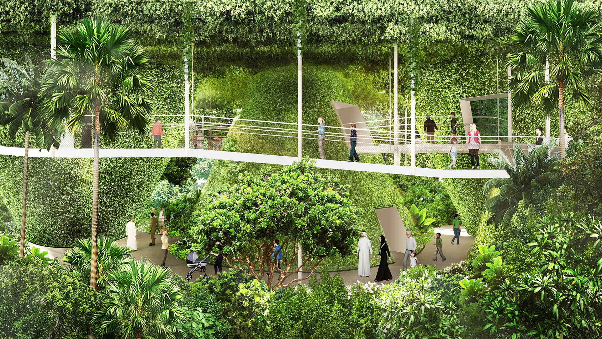 As visitors make their way into the Singapore Pavilion, they will journey through three verdant thematic cones – Rainforest Cone, City Cone, and Flower Cone– each housing key exhibits that showcase Singapore’s transformational journey, solutions to urban issues, as well as efforts in creating a sustainable future for our people. The three cones are connected by a meandering, gently-sloping Canopy Walk capped with a hanging garden of draping vines, re-creating the atmosphere of the lush tropical urban landscape of Singapore.