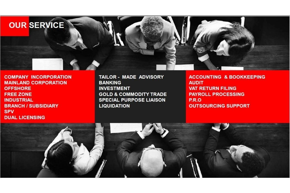 Company Incorporation, Mainland Corporation, Offshore, Freezone, Industrial, Branch/Subsidiary, SPV, Dual Licensing, Tailor made Advisory, Banking, Investment, Gold and Commodity Trade, Special Purpose Liaison, Liquidation, Visa Services - Employment and Family Visa, Accounting & Bookkeeping, Audit, VAT Return Filing, Payroll Processing, P.R.O, Outsourcing Support.