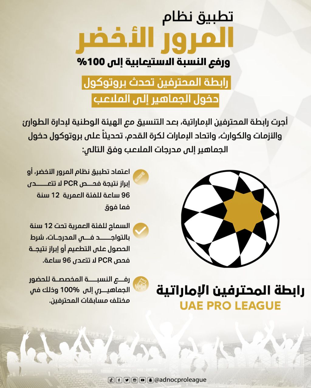 The UAE Football Association (UAEFA) has made, in coordination with the National Emergency Crisis and Disaster Management Authority and the UAE Pro League, an update to the stadium entry protocol, whereby, spectators of all football matches will be allowed at 100 percent capacity.