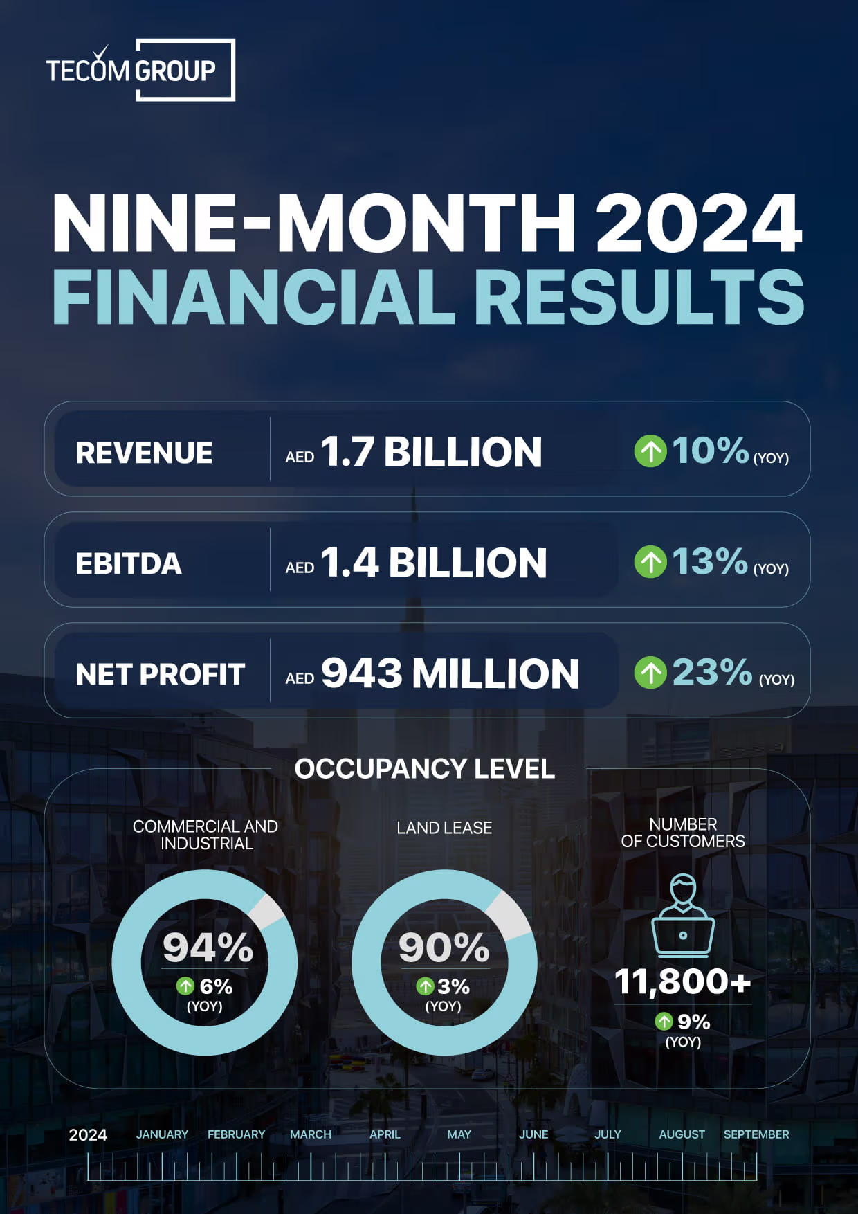 TECOM Group PJSC (DFM: TECOM), renowned for developing specialized business districts, has announced exceptional financial results for the nine months and the third quarter of the year ending September 30, 2024.