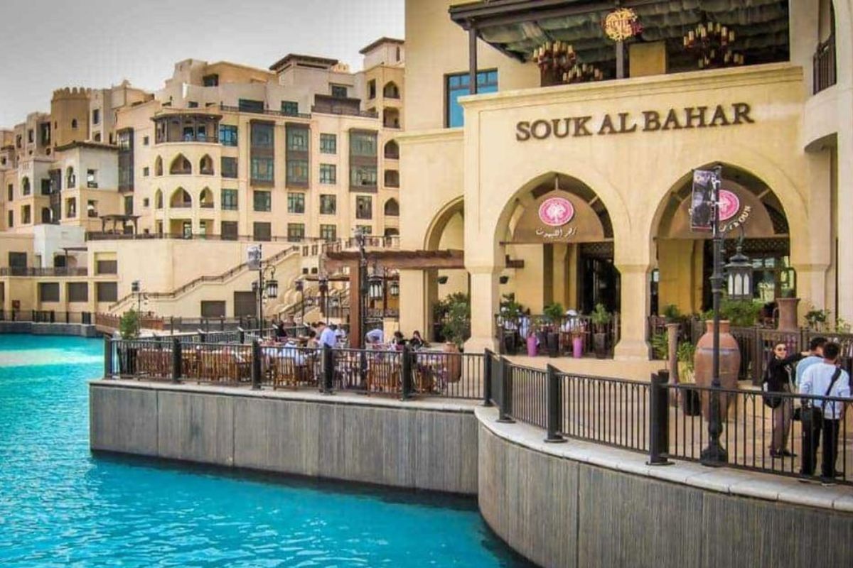 Souk Al Bahar area is also a nice spot to observe the Show. It is a modern Arabian Souk that can be reached by crossing the bridge from the Dubai Mall over the man-made Burj Lake. The Souk Al Bahar is a popular shopping, entertainment, and dining destination for residents as well as tourists visiting the area. You can buy traditional souvenirs, as well as clothes, perfumes, jewels, local delicacies and much more. The Souk also serves a variety of international cuisines, including sushi, American-style barbecue, Mexican, and Lebanese dishes. You can view the fountain from either standing near the viewing area near the Souk or dine at one of its many restaurants that provide you the view of the Dubai Fountain and the Burj. It is also less crowded than the Waterfront Promenade in front of the Dubai Mall.
