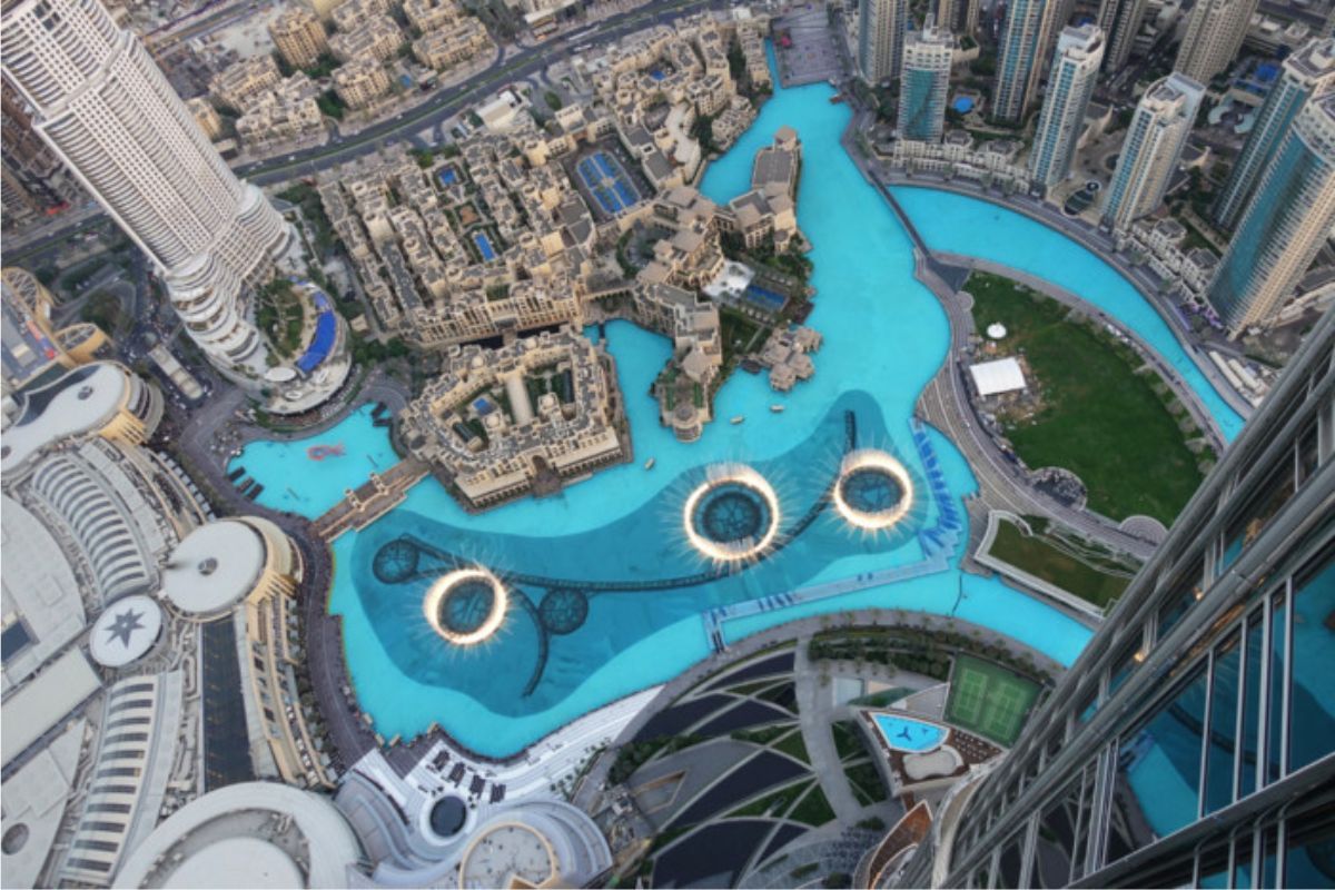 • The Dubai Fountain is well-lit by 6,600 powerful lights and 25 color projectors, it can shoot water up to 500 feet —as high as a 50-storey building.