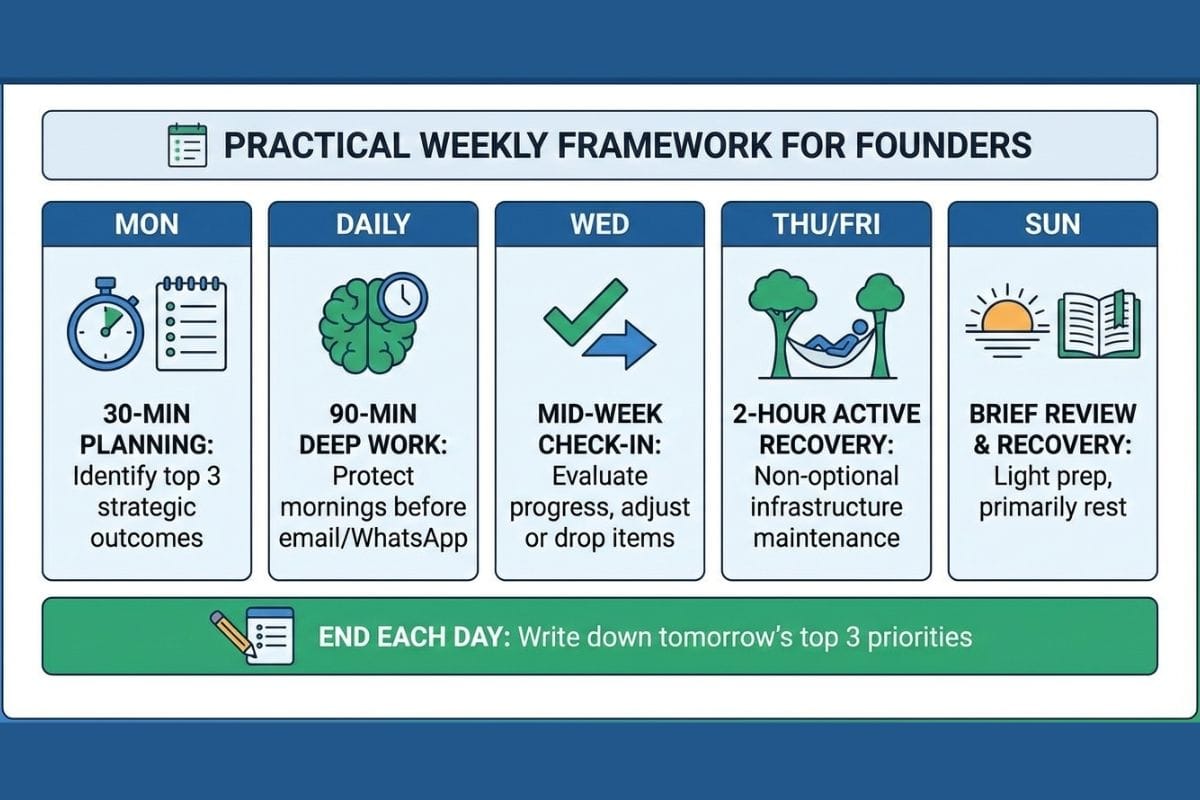 To make this actionable, here's a realistic weekly framework for founders managing demanding businesses: