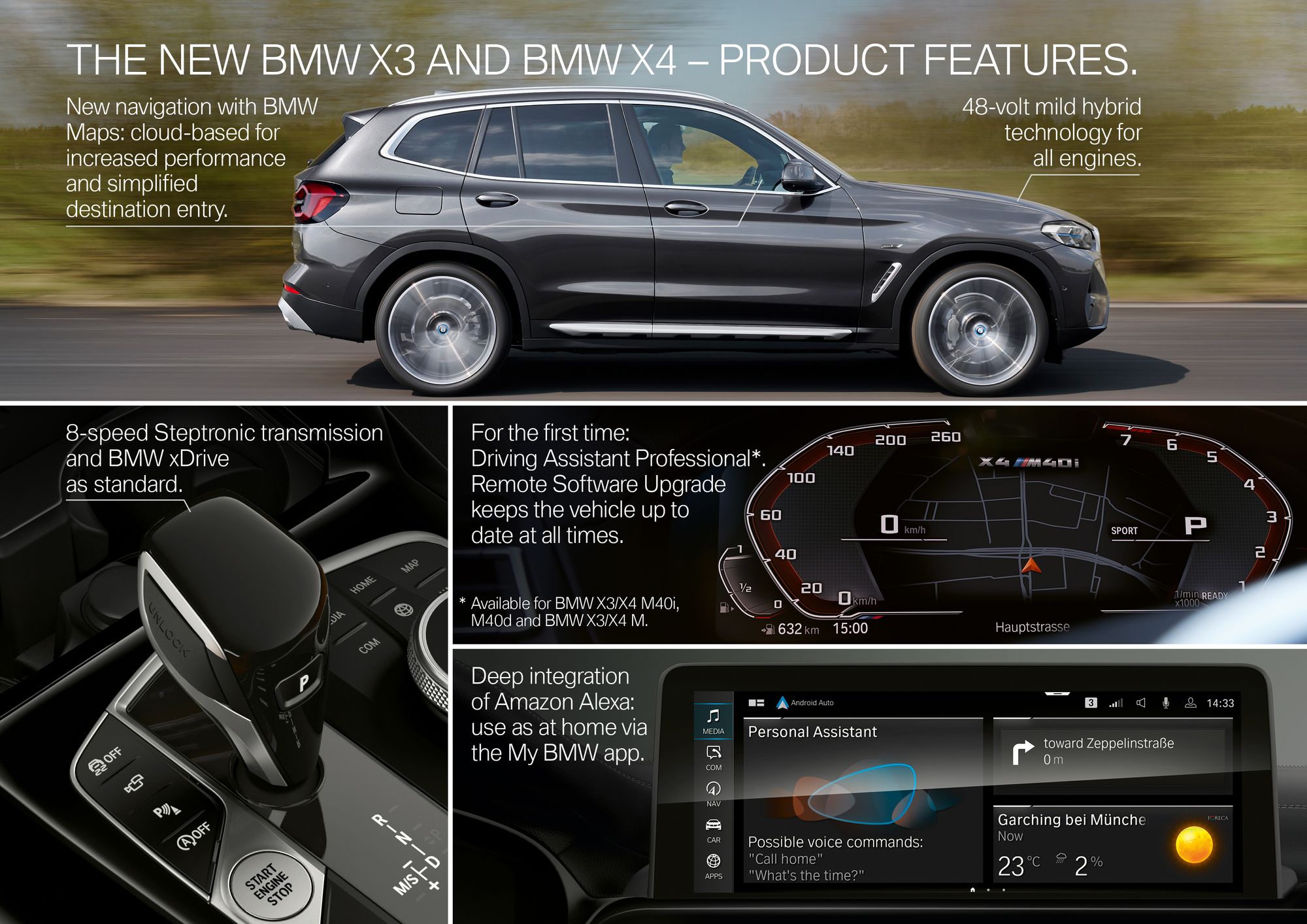 Sportier, more modern and more digital. For the second phase of the model cycle, BMW has refreshed its successful Sports Activity Vehicle (SAV) BMW and the Sports Activity Coupé (SAC) BMW with a new look, improved equipment and a range structure which has been optimized for customers. The redesigned front end and revised rear section lend even clearer emphasis to the robust off-road look and sporty appearance of the third-generation BMW X3. Its coupé counterpart, the second-generation BMW X4, adopts the new front end, adds its own accentuation with the exclusive BMW mesh kidney grille and offers a particularly dynamic rear end. The refresh is rounded off with a modern interior with new equipment features and updated infotainment. BMW M GmbH is also upgrading the M models of the BMW X3 and BMW X4 at the same time.
