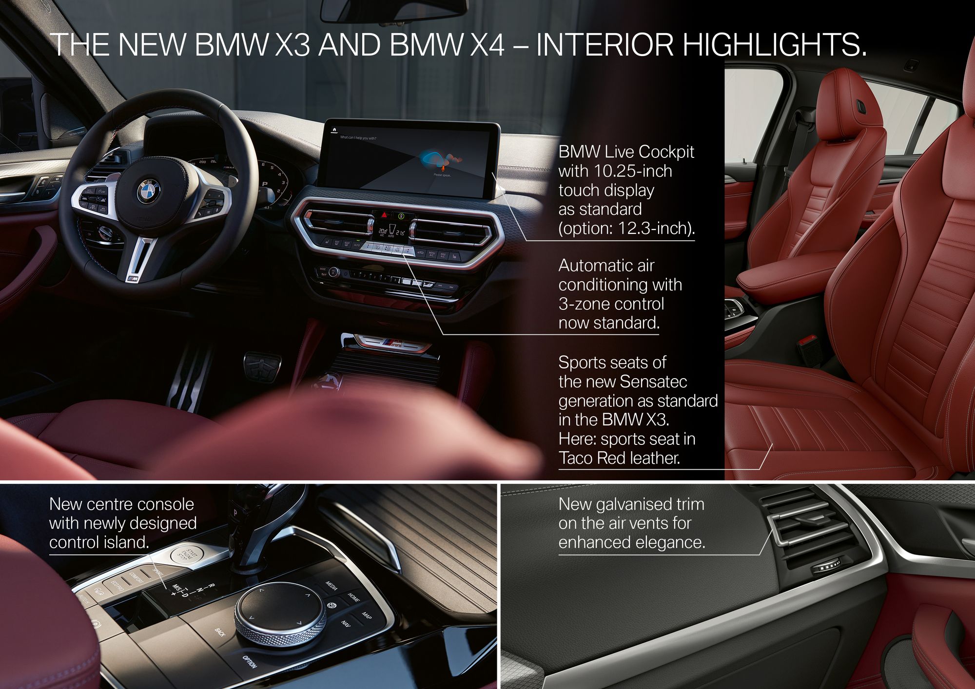 The new BMW X3 and the new BMW X4 adopt the centre console of the current BMW 4 Series. The free-standing, central Control Display with touch function now offers a screen diagonal of 10.25 inches as standard in all vehicles. A 12.3-inch version of the touch display is also available as an option. The significantly improved standard equipment now also includes sports seats with covers from a new Sensatec generation in the new Ray grain and with perforated main seat surfaces, as well as automatic climate control with 3-zone control. In order to make the vehicle configuration process clearer and more straightforward for customers, not least reducing the number of conflicts, the complexity of the equipment lines and optional extras has deliberately been reduced by 30 per cent.
