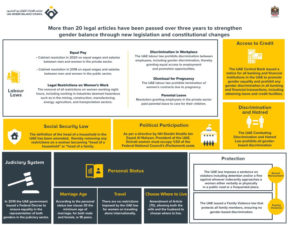 Over the past three years, the UAE amended more than 20 legal provisions related to employee benefits such as equal pay for equal value, parental leave, prohibition on firing pregnant women, and equal access to credit.