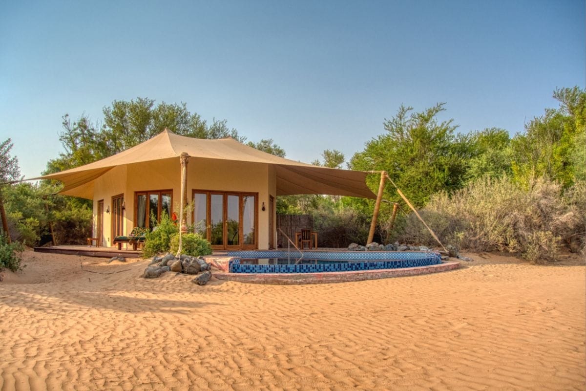 Set in the Dubai Desert Conservation Reserve, Al Maha Resort offers a serene, guest-only oasis amid lush palm groves and golden dunes, with stunning views of the plains and Hajar Mountains. Guests can enjoy activities like horse riding, camel trekking, and nature walks.