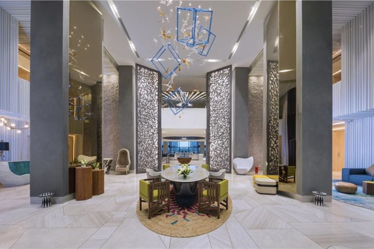 In addition to the hydroponic farm, Andaz Dubai The Palm has implemented several other eco-friendly practices. The hotel has eliminated single-use plastics, adopted sustainable alternatives, and introduced a paperless initiative across all departments. Room amenities are sustainably packaged and sourced locally, and eco-friendly detergents are used for housekeeping. The hotel's fragrance is created in collaboration with a UAE-based perfumer family, emphasizing local partnerships.