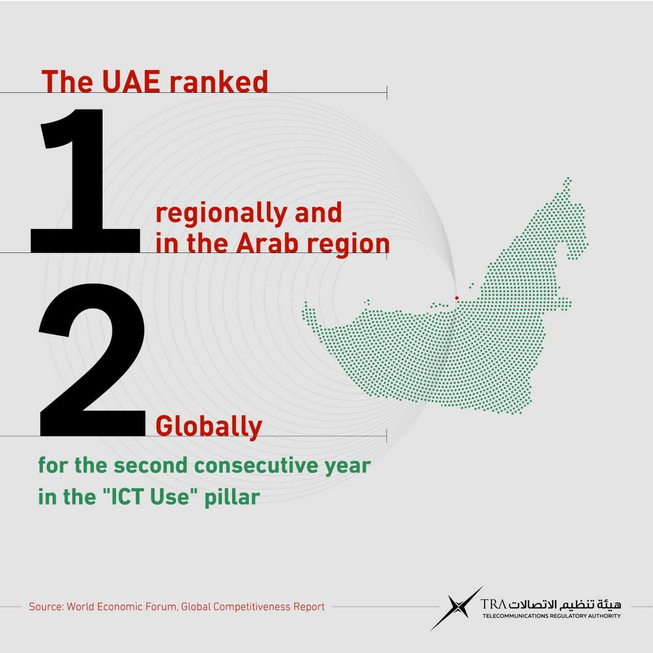 The UAE concluded 2020 by achieving global leadership in telecom sector quality and evolution, where the country maintained the first place in the Arab region and regionally, and came second globally for the second consecutive year in "Use of telecommunications/ICTs", which measures the efficiency and evolution of the telecommunications sector in countries around the world as part of the Global Competitiveness Report issued by the World Economic Forum.