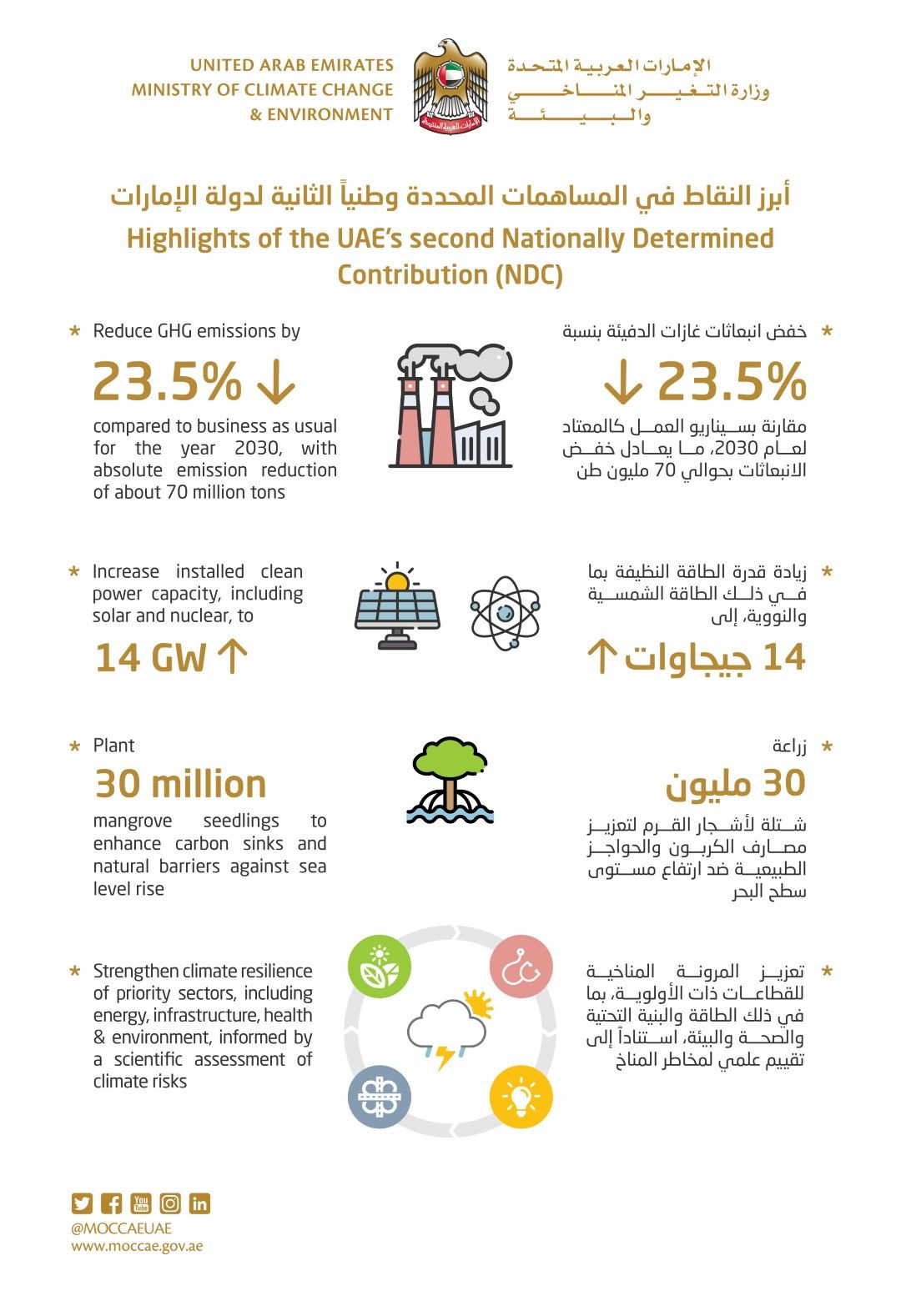 "The UAE’s climate efforts support its agenda of economic and energy diversification. Furthermore, with higher ambitions, the country’s second NDC under the Paris Agreement strengthens the global response to the threat of climate change in line with the country’s commitment to shaping a better future for the current and next generations."