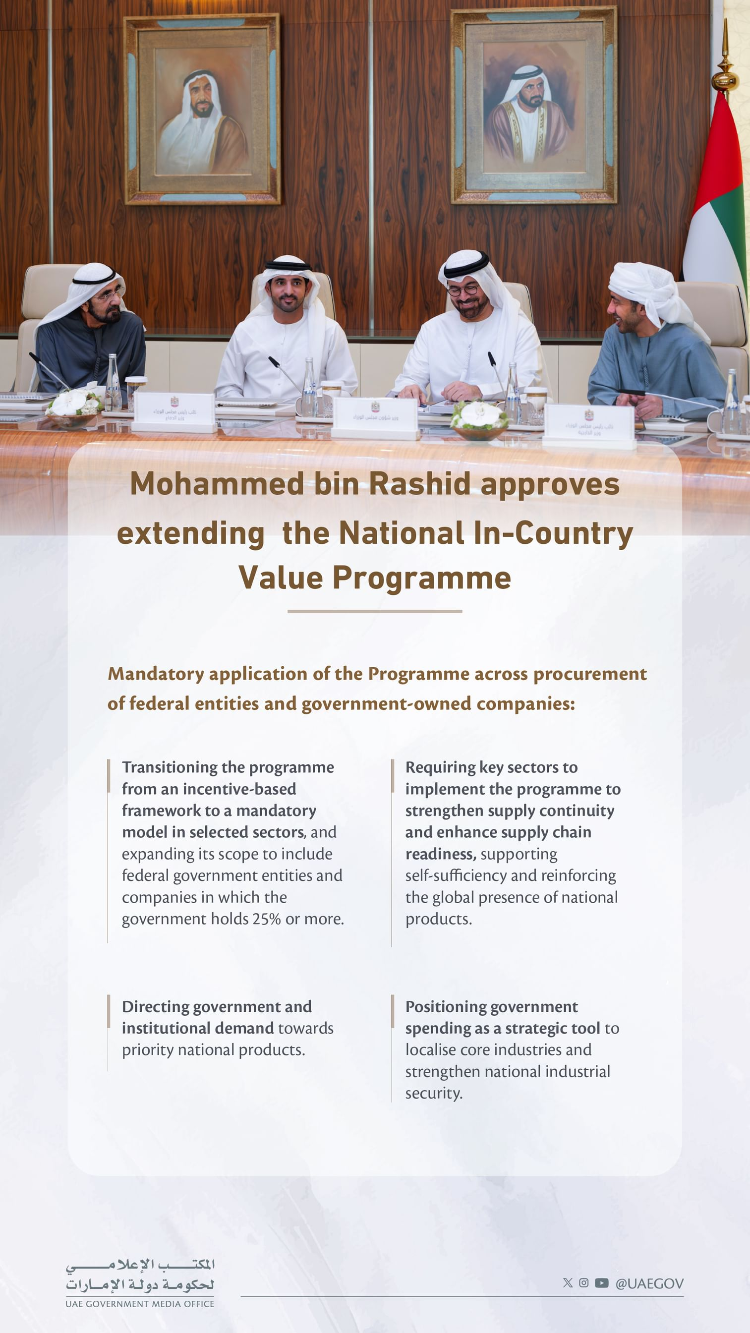 The announcements came alongside a Cabinet review of preparations for the fifth edition of Make it in the Emirates, running from 4 to 7 May at ADNEC in Abu Dhabi. The forum is expected to draw over 120,000 visitors and more than 1,000 exhibitors spanning 12 industrial sectors, with small and medium enterprises making up 61% of participants.