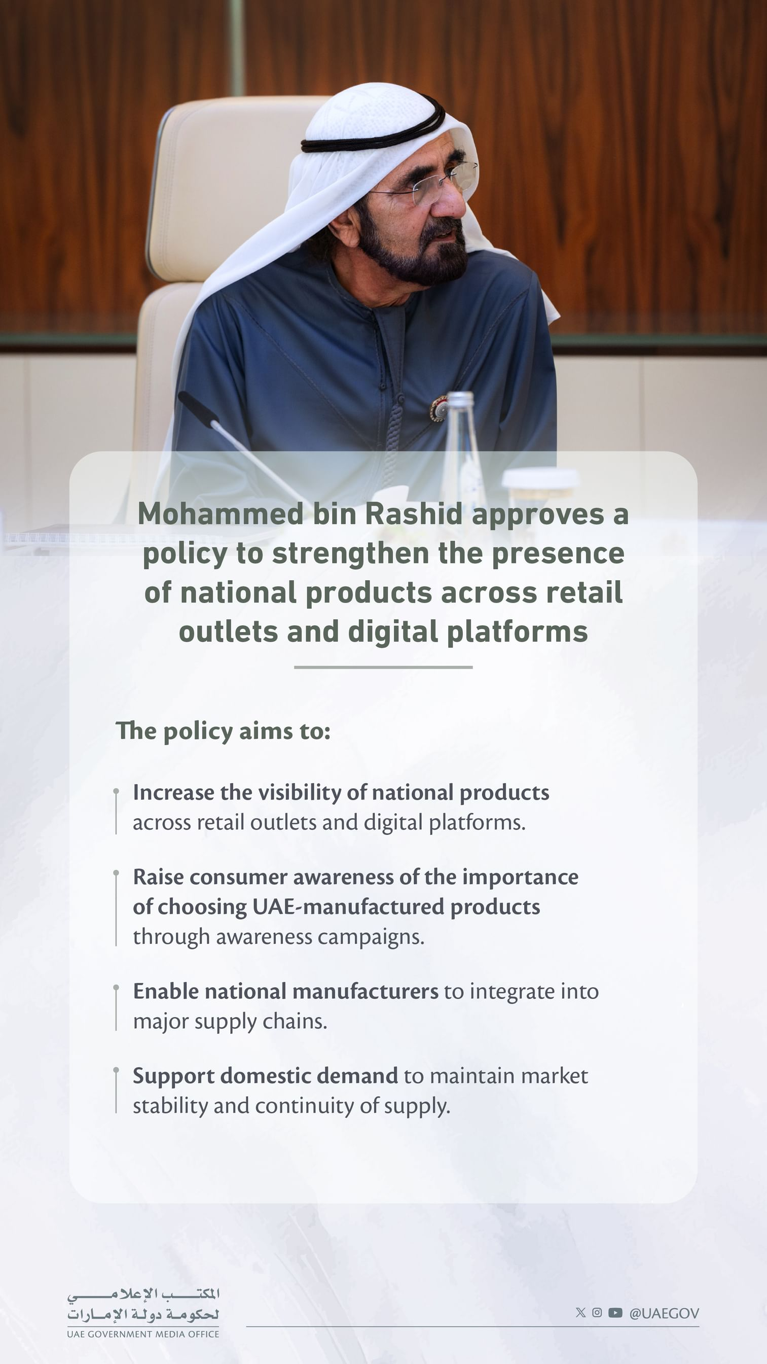 The Cabinet also approved a policy to strengthen the shelf presence of UAE-manufactured goods across retail outlets and digital platforms. The first phase targets high-volume essentials with scalable local production, including bottled water, dairy, eggs, poultry, bread, flour, packaged vegetable oils and seasonal produce.
