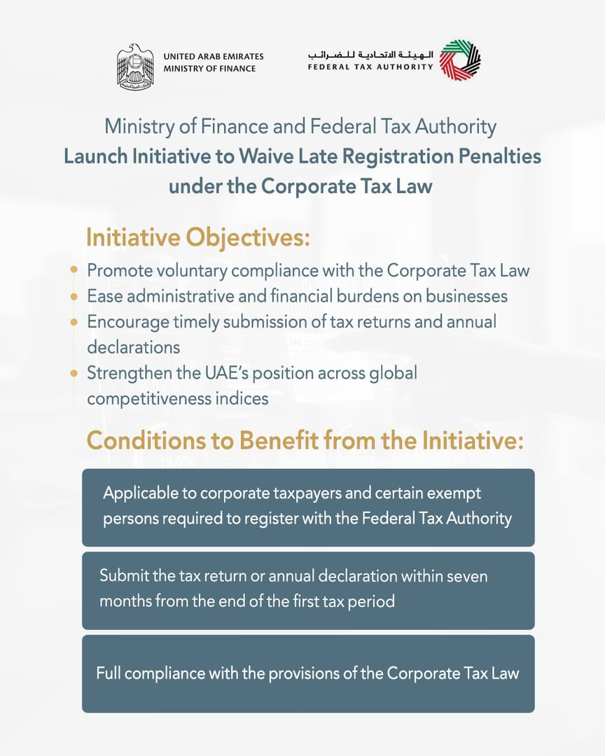 Announced by the Ministry of Finance and the Federal Tax Authority, the initiative applies to entities that failed to submit their tax registration applications on time. To benefit from the waiver, eligible taxpayers must file their tax return or annual statement within seven months of the end of their first tax period, in line with the Corporate Tax Law.