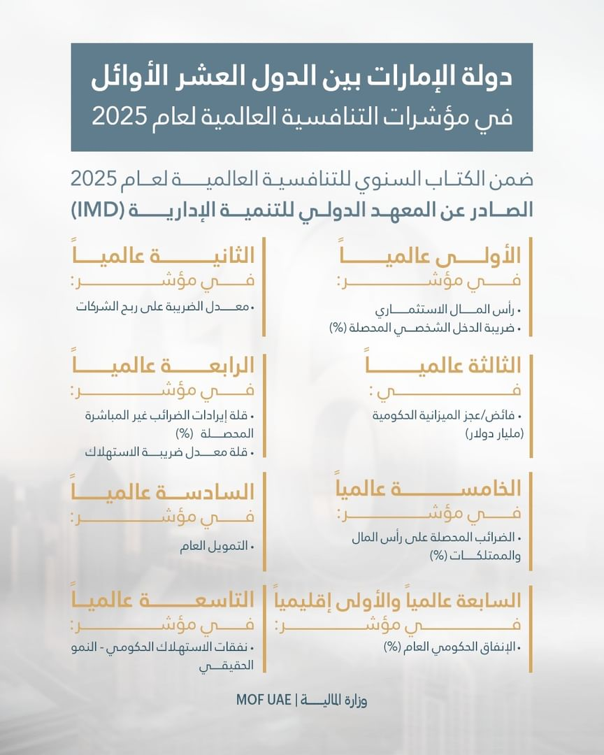 In addition to its jump in the Government Support Index, the UAE ranked among the world’s top ten in several competitiveness indicators. The country secured first globally in venture capital and personal income tax collection as a share of GDP, second in corporate profit tax rates, and third in government budget surplus. It also ranked highly in government expenditure efficiency and real growth of public consumption.