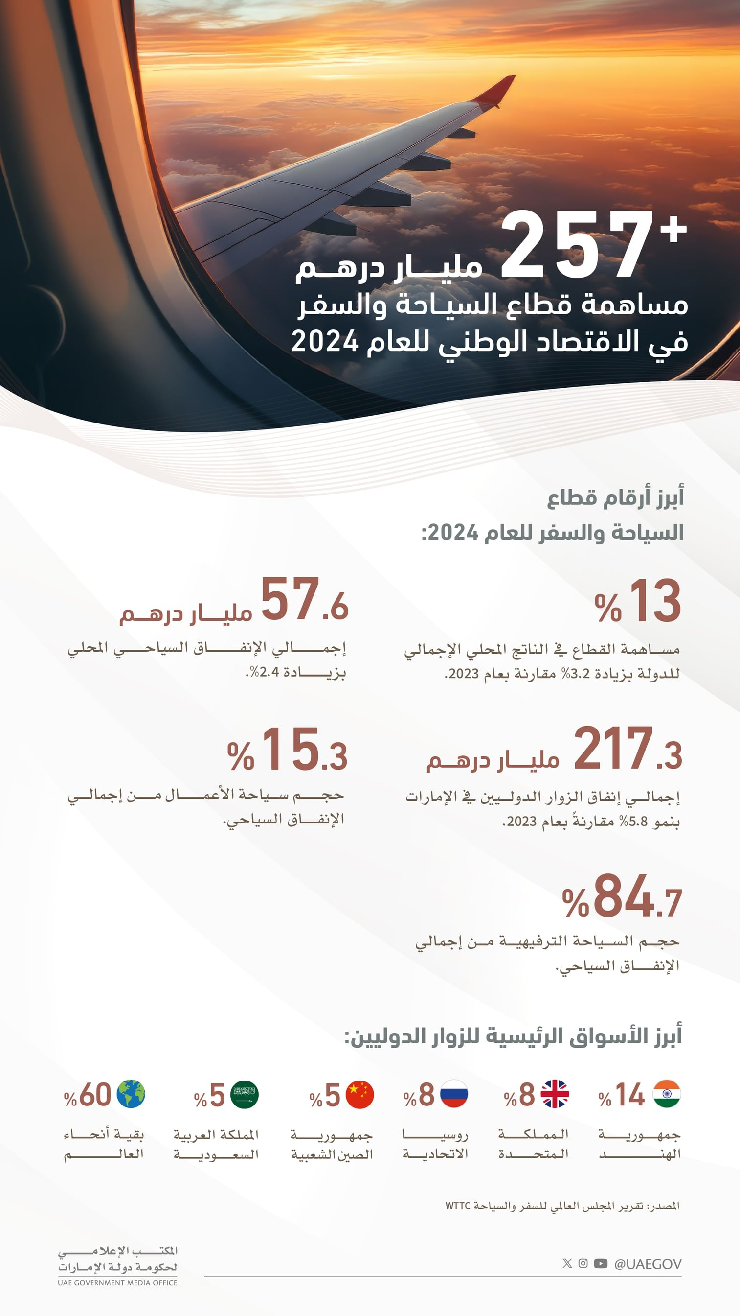 The UAE’s tourism sector delivered a record-breaking performance in 2024, contributing AED257.3 billion (US$70.1 billion) to the national GDP—13% of the country’s economy—according to the latest report from the World Travel and Tourism Council (WTTC).