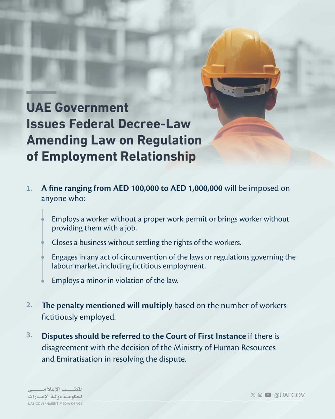 The new decree introduces significant penalties for employers violating the law. Employers who hire workers without proper permits, fail to provide jobs to workers brought into the country, misuse work permits, or shut down businesses without settling workers' rights face fines ranging from AED 100,000 to AED 1 million. Similar penalties apply to those involved in the illegal employment of minors or allowing minors to work unlawfully.
