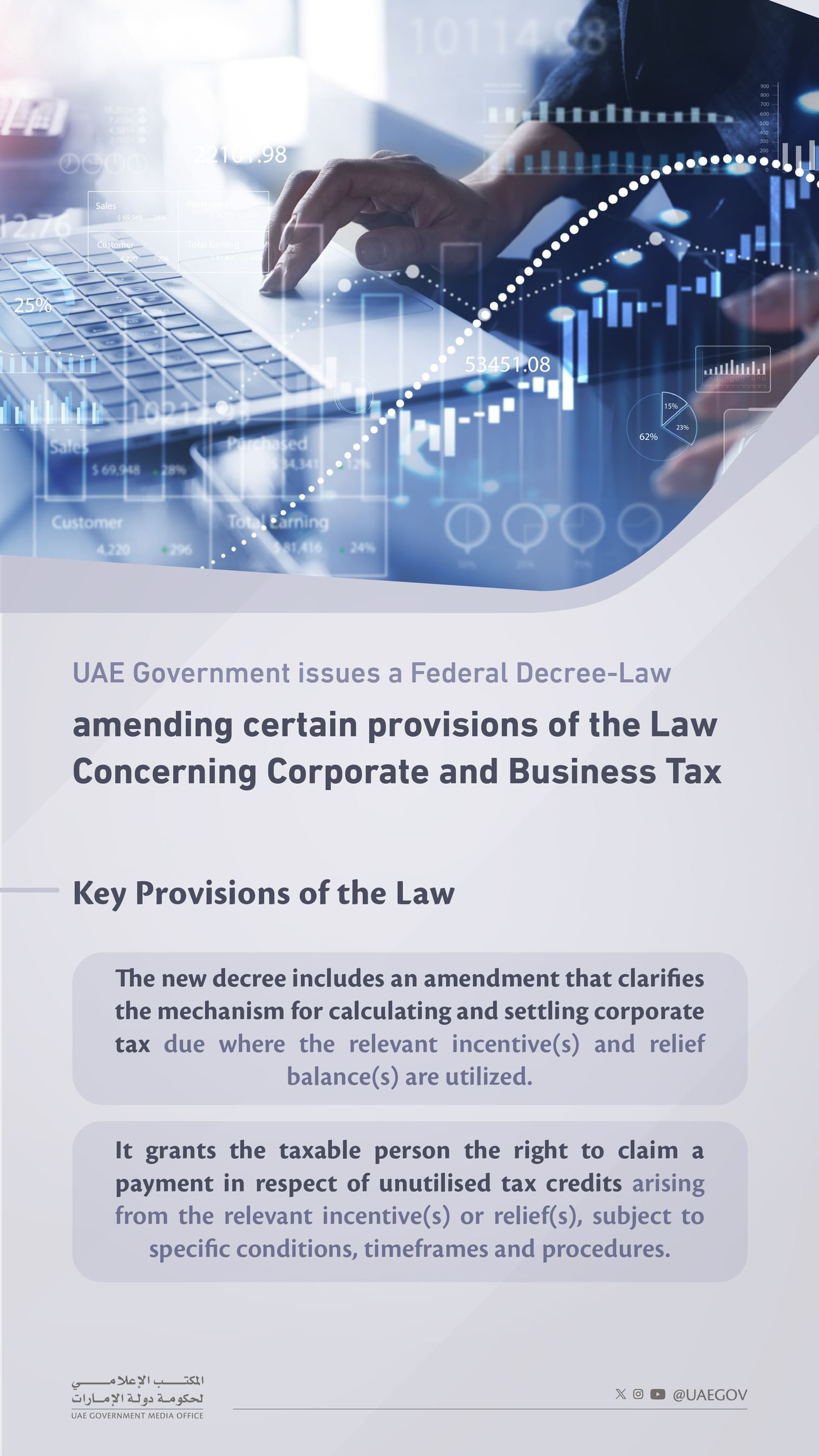 The Federal Decree-Law modifies provisions of Federal Decree-Law No. 47 of 2022, introducing a structured mechanism for settling corporate tax liabilities. Taxable persons will now settle dues sequentially, starting with withholding tax credits, followed by foreign tax credits, and then other incentives or reliefs as determined by the Cabinet. Any remaining corporate tax must be paid in line with existing provisions.