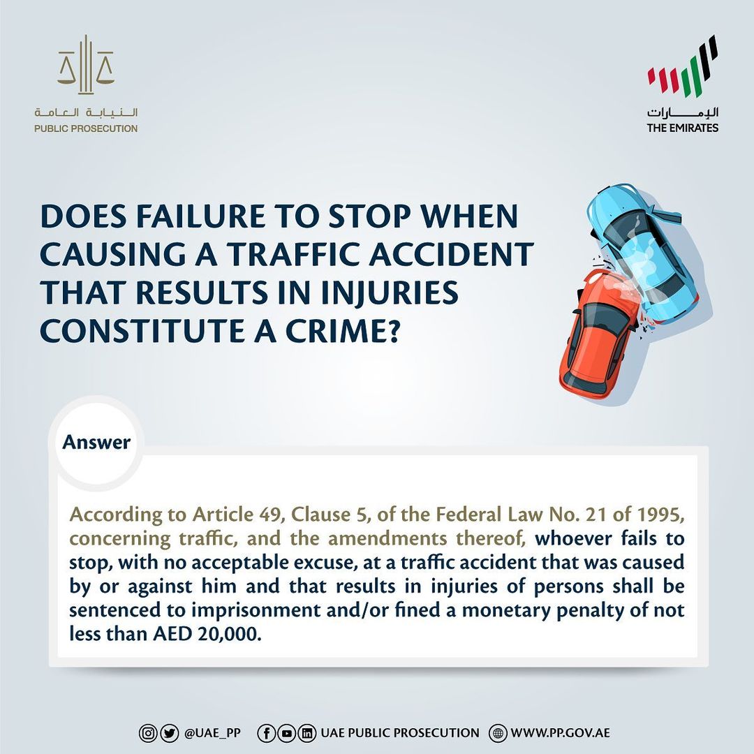 Motorists who fail to stop their vehicle following a traffic accident that results in injuries will either face imprisonment or pay a minimum fine of Dh20,000, the UAE Public Prosecution has warned.