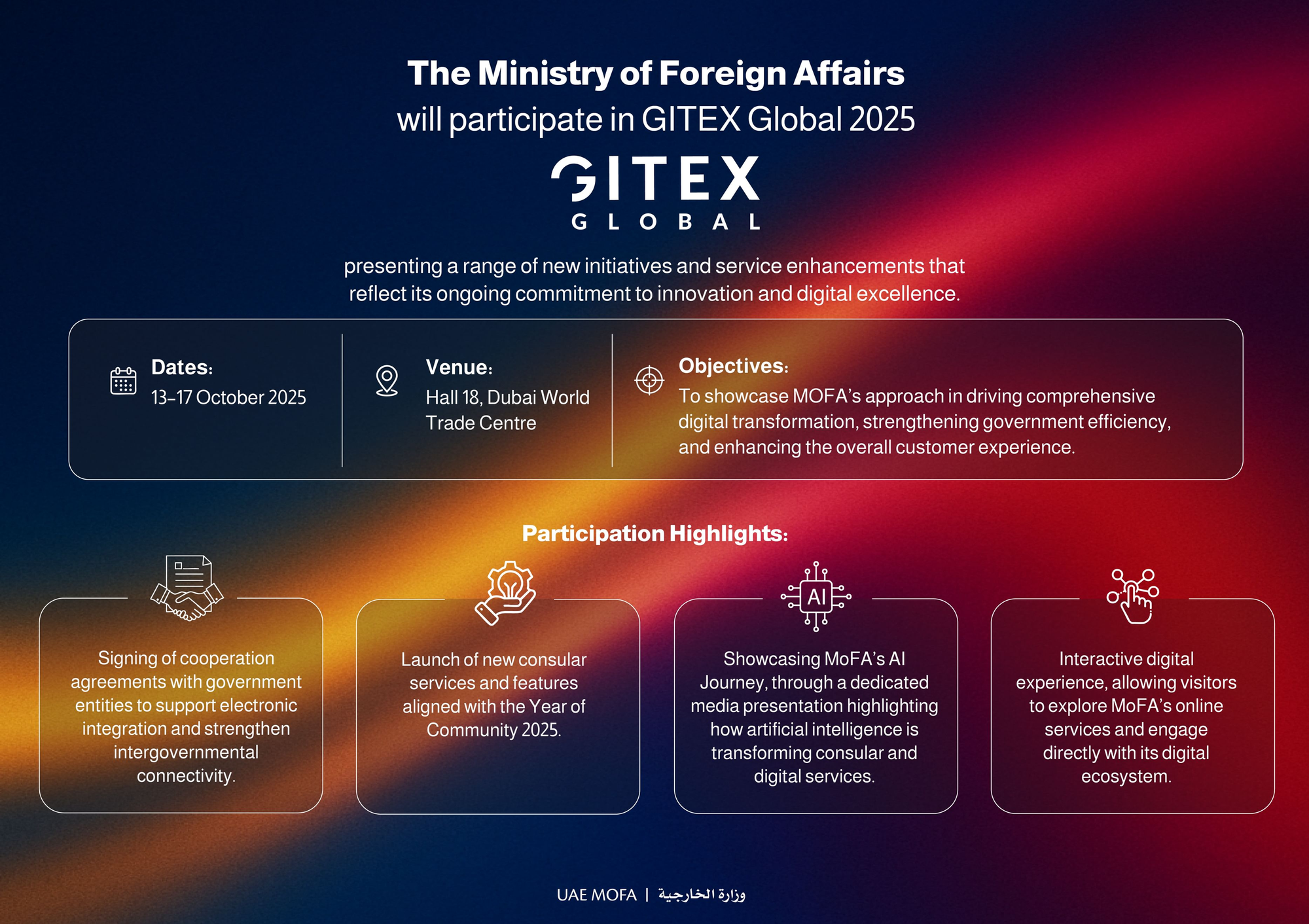 GITEX Global 2025 runs from 13th to 17th October at the Dubai World Trade Centre. MoFA will present its latest initiatives under the Telecommunications and Digital Government Regulatory Authority platform, focusing on proactive, innovative, and user-centric services.