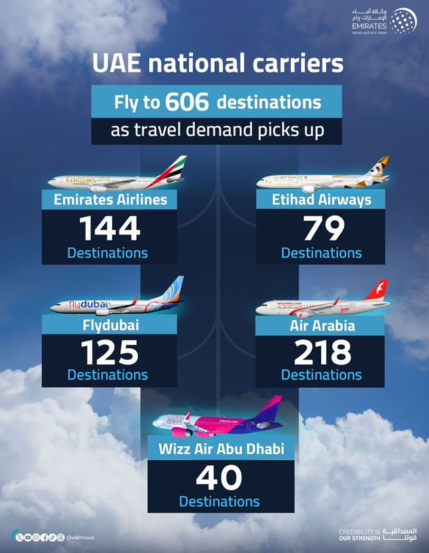 As of mid-2024, UAE carriers now serve approximately 606 destinations worldwide, marking a 3.4% increase from the 586 destinations at the end of 2023. Emirates leads the pack with over 144 destinations, followed by Air Arabia with 218, flydubai with 125, Etihad Airways with 79, and Wizz Air Abu Dhabi with 40 destinations.