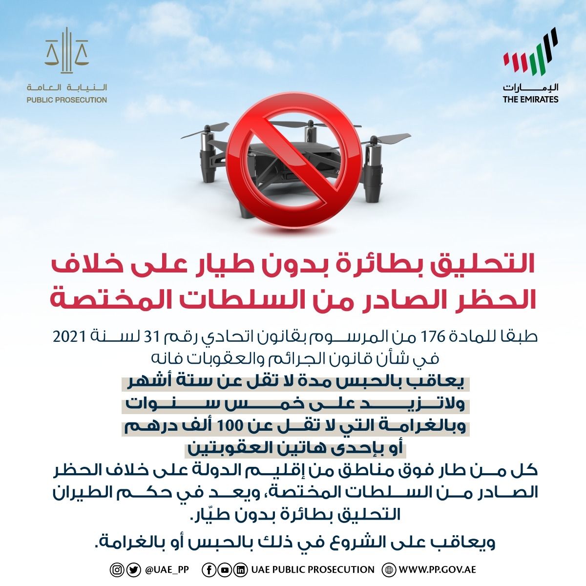 The UAE Public Prosecution (PP) explained today, through posts on its social media accounts, the penalties for flying a drone in violation of the ban issued by competent authorities.