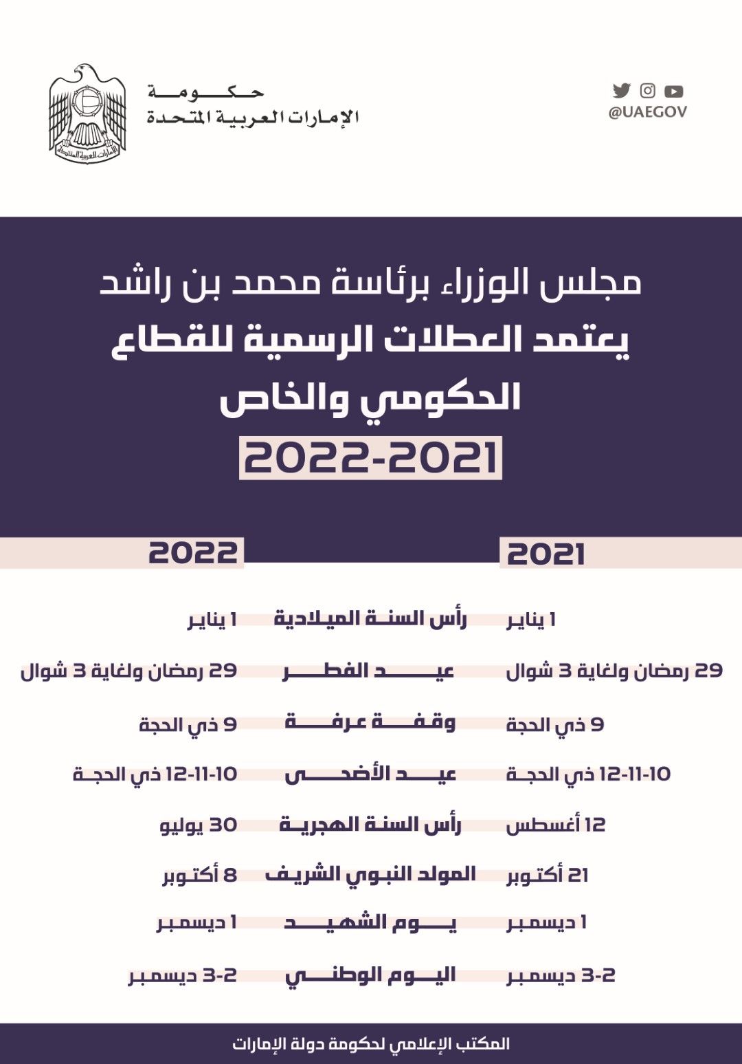 The UAE Cabinet has announced the national holidays for both the public and private sector for the years 2021 and 2022.