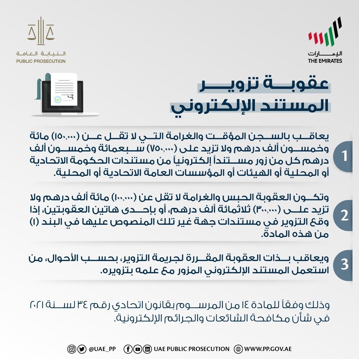 The UAE Public Prosecution (PP) explains today the penalties for falsifying an electronic document, through a post on its social media account.