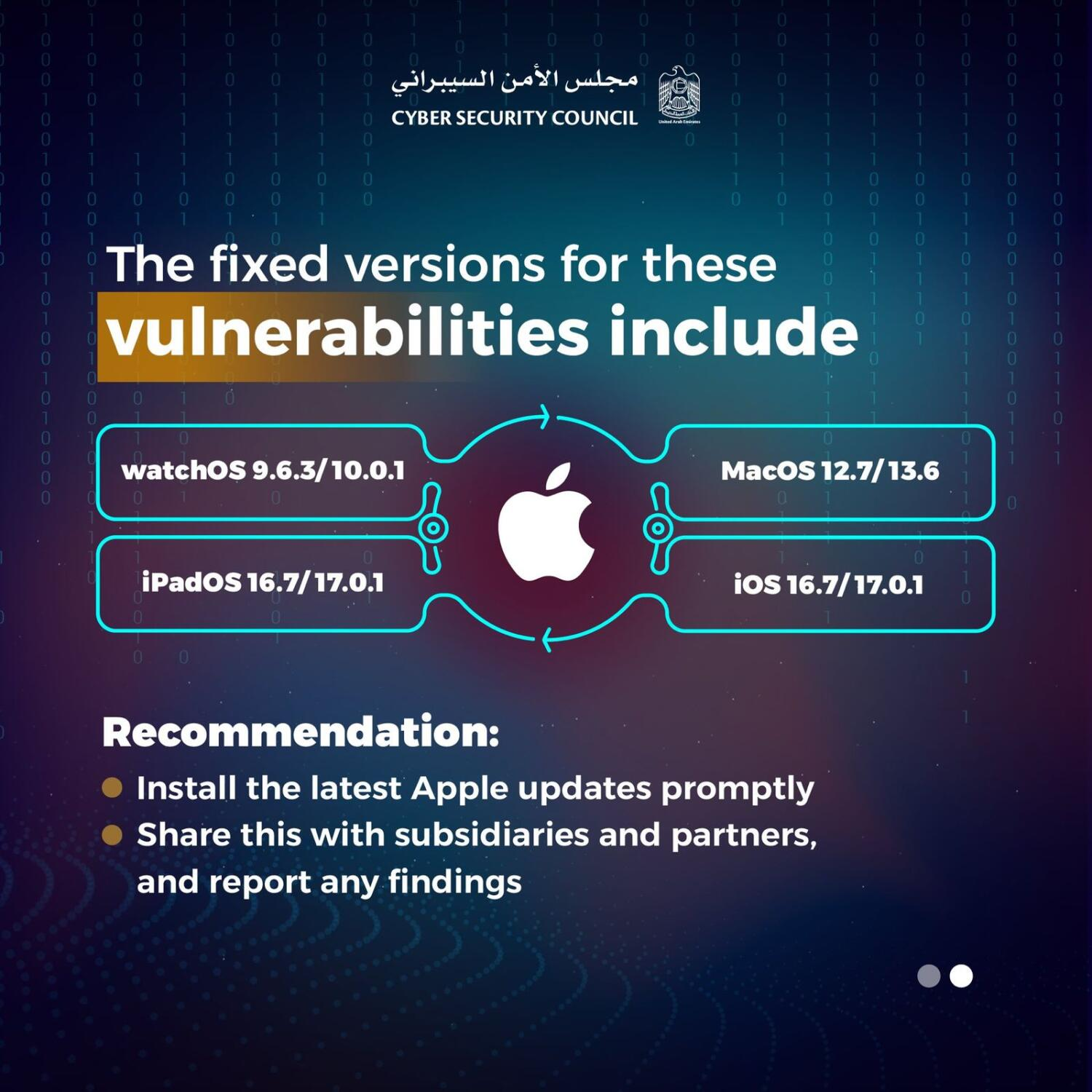 The UAE's Cyber Security Council has issued an alert on security vulnerabilities that have been detected in certain Apple devices.