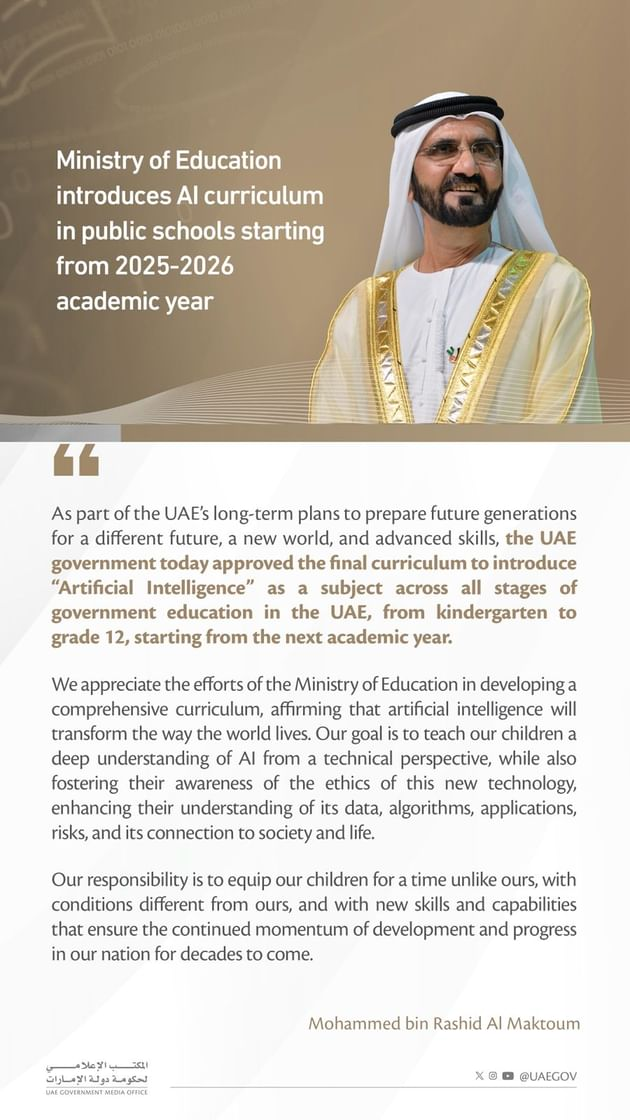 This initiative aims to equip students from kindergarten through Grade 12 with essential AI knowledge and skills, positioning the UAE as a global leader in AI education.