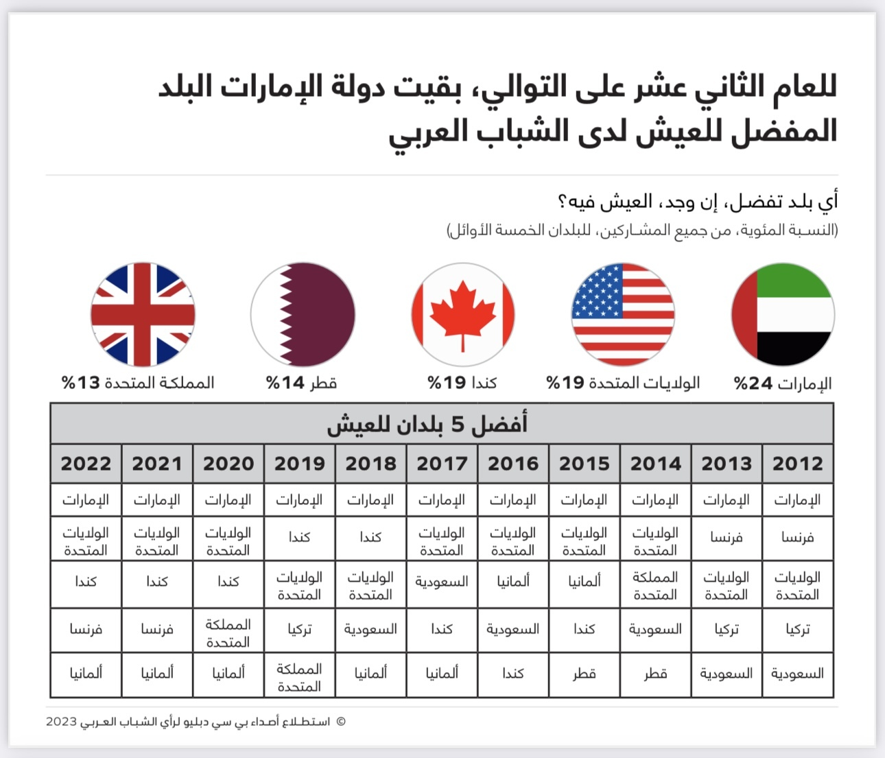 For the 12th consecutive year since they were asked to name the countries they consider ‘model nations’, Arab youth have said the United Arab Emirates is the country they would most like to live in and the one they would most want their own to emulate.