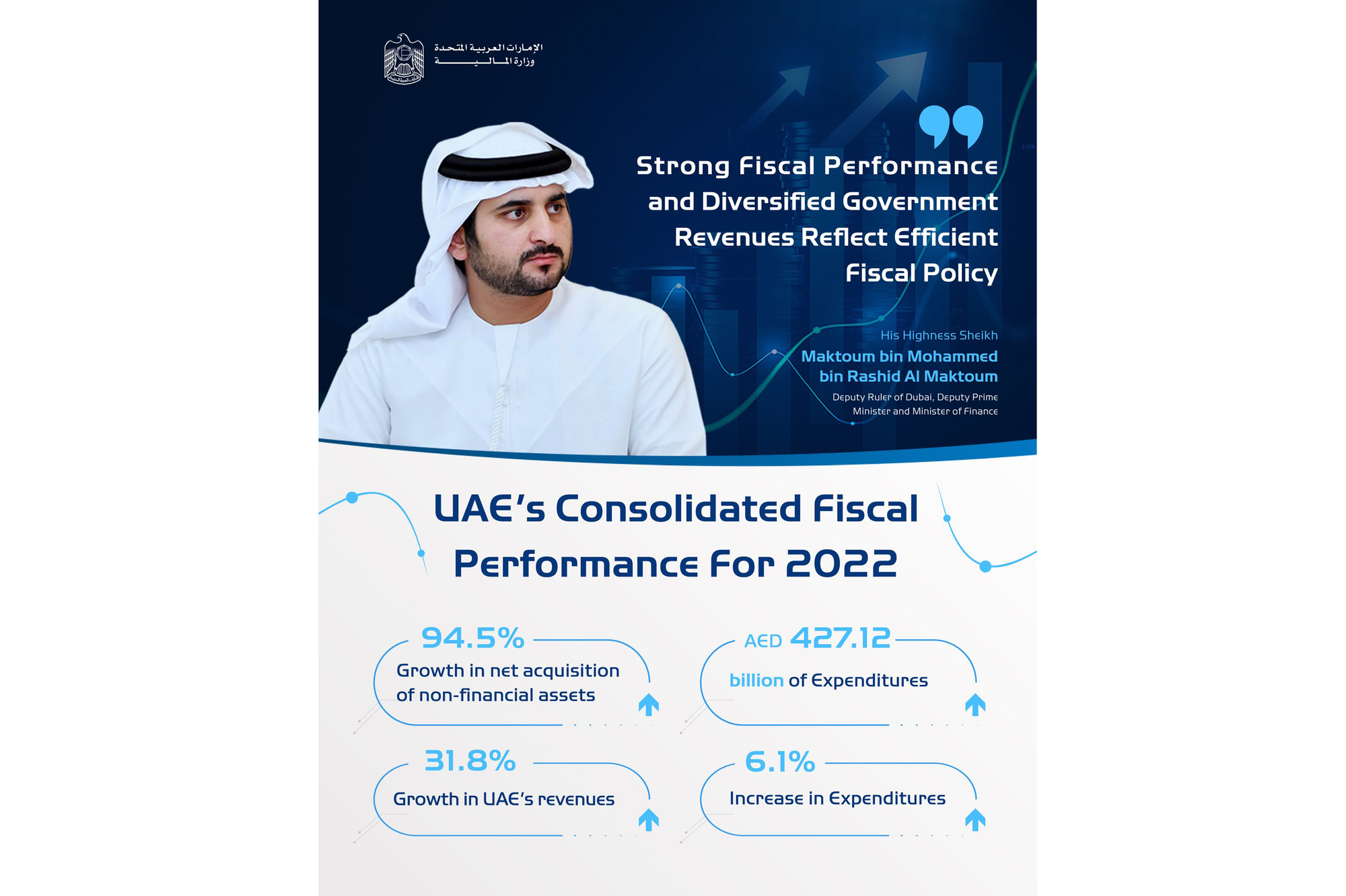 His Highness Sheikh Maktoum bin Mohammed bin Rashid Al Maktoum, Deputy Ruler of Dubai, Deputy Prime Minister and Minister of Finance, said that the UAE's strong fiscal performance and diversified government revenues reflect efficient fiscal policy, with overall fiscal balance surplus recorded in 2022, a 31.8% year-on-year growth in revenues, and a 6.1% increase in expenditures, which amounted to approximately AED427.12 billion.