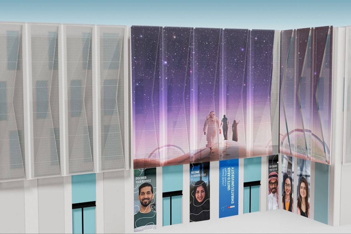The lower panel of the facade adds to the overall design by displaying several portrait photographs of UAEU students imprinted across the building. The photographs demonstrate the diversity and pavilion's core focus, youth empowerment and growth with eager students determined to make a difference.