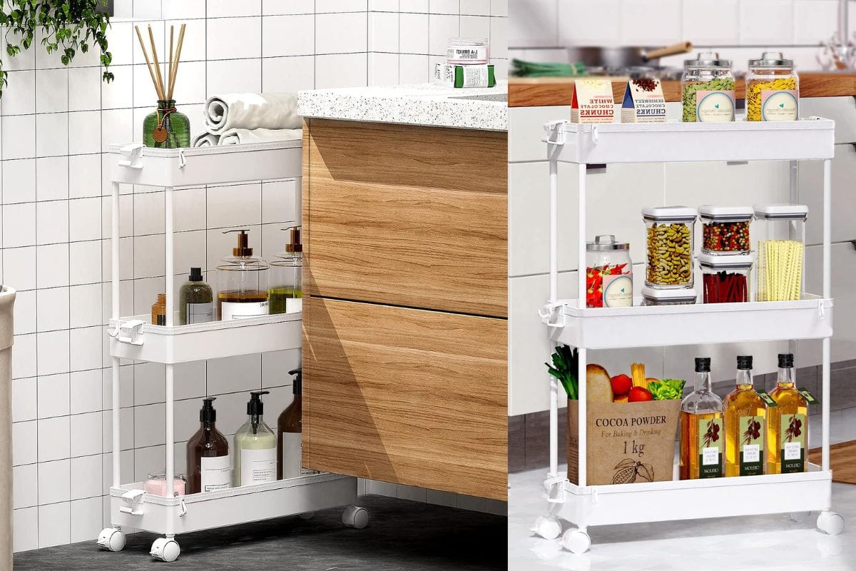 Optimize your storage space with the SPACEKEEPER Slim Rolling Storage Cart. Ideal for narrow spaces in bathrooms, kitchens, and laundry rooms, this 3-tier, slim cart is a practical addition to any home or office.