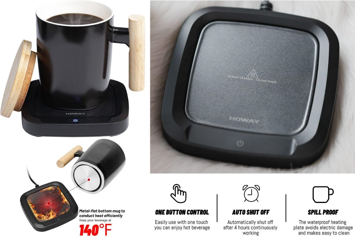 Note that the warmer is for maintaining warmth, not for boiling water. The set comprises 1 Coffee Warmer, 1 Ceramic Mug, and 1 Bamboo Lid.