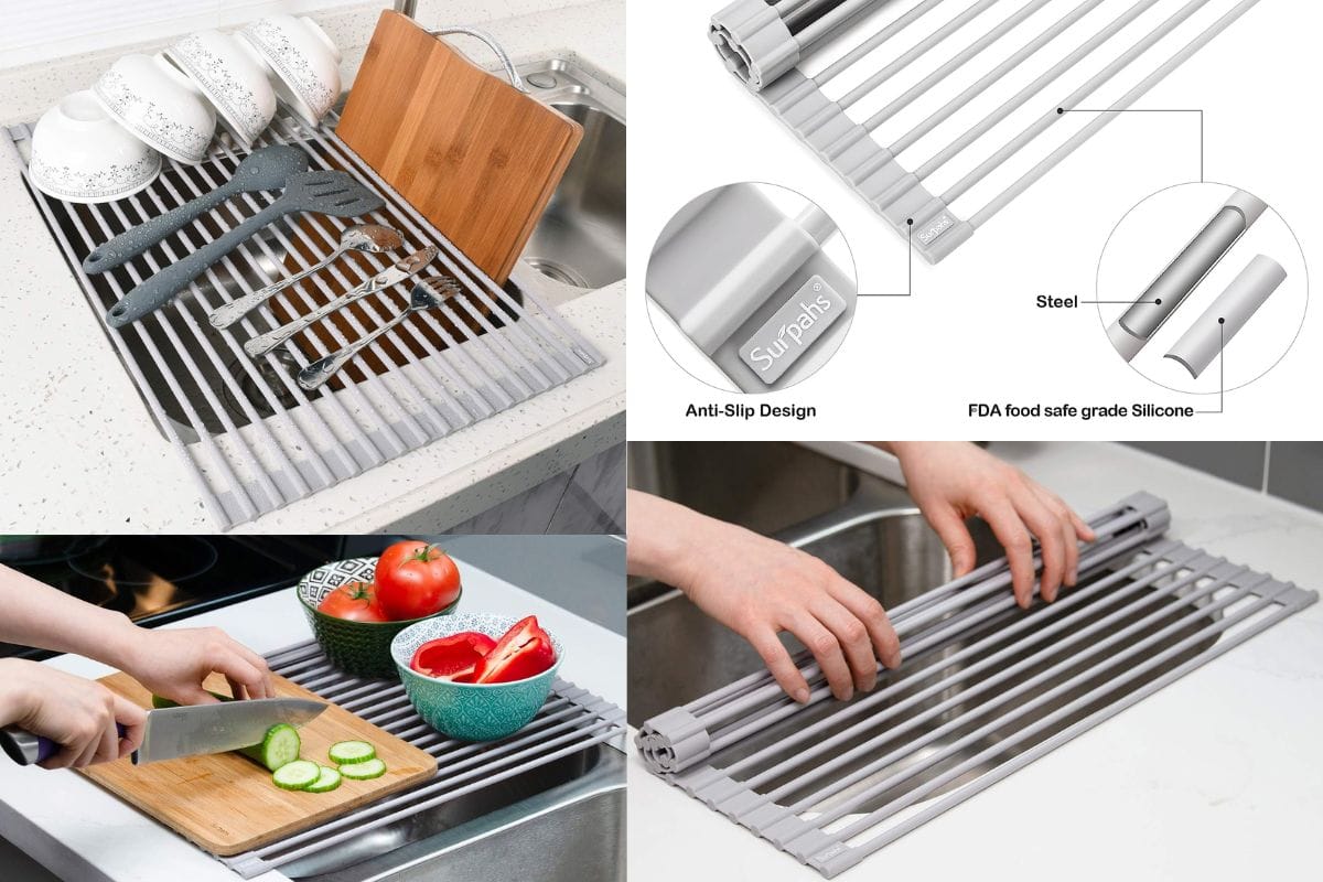 Maximize your kitchen space with this compact, silicone-coated steel gadget, ideal for smaller sinks. FDA-approved and rust-resistant, it's durable, non-slip, and easy to clean. Heat resistant up to 400°F, it also serves as a trivet mat.