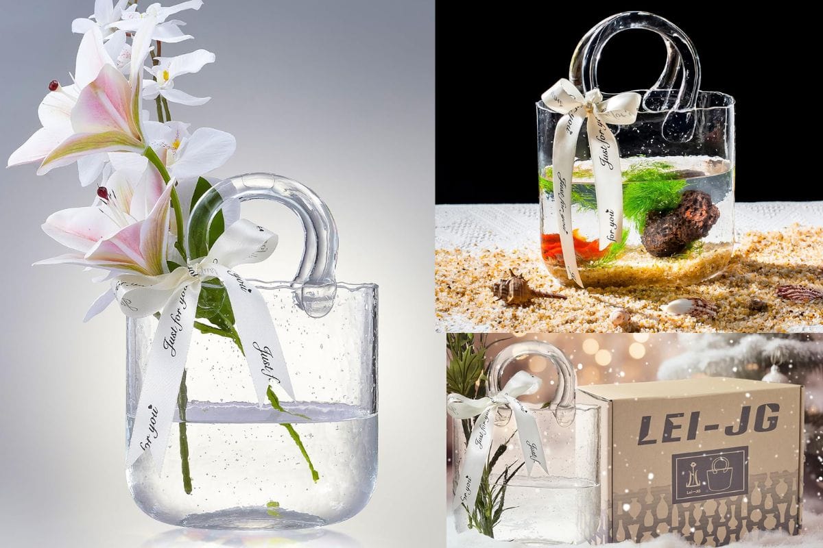Add a touch of elegance to your decor with the Lei-JG Handmade Glass Vase, uniquely designed to resemble a lady's handbag. Crafted using hand-blowing techniques and high-quality quartz sand, this vase features a stable flat bottom, handles firmly fixed to the body, and intriguing bubble-like particles in the glass that enhance its beauty, especially when filled with water.
