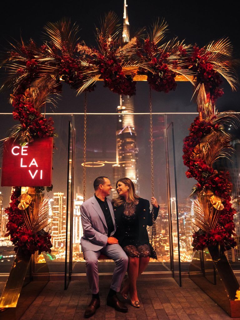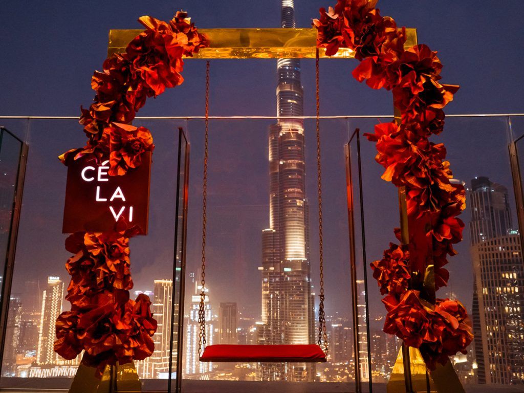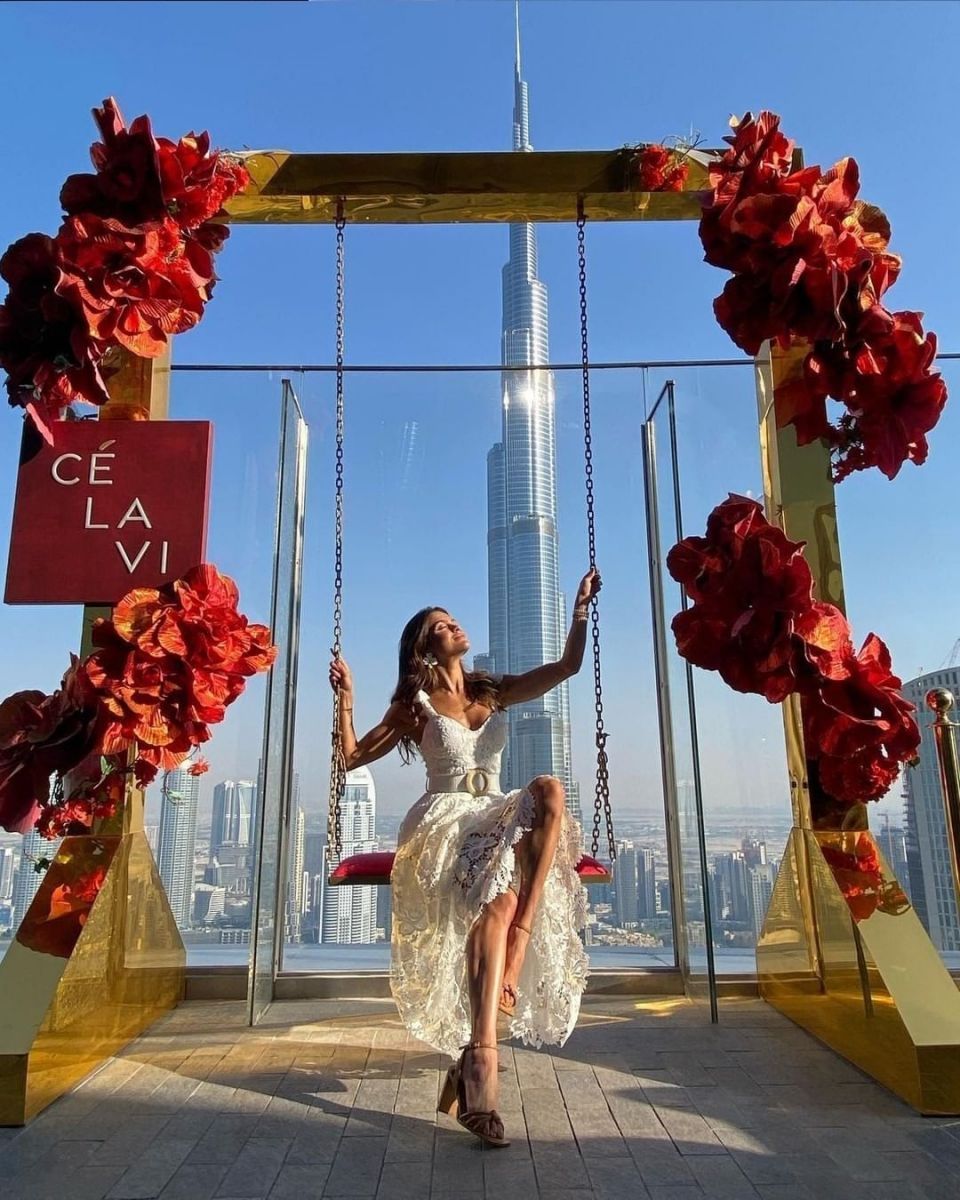 CE LA VI is an upscale rooftop restaurant that features a stunning flower-covered swing with views of the Burj Khalifa. This Dubai Instagram spot can be found on the 54th floor of the Address Skyview Hotel, a luxury hotel in the heart of downtown Dubai. The swing is a well-known place to take photos in Dubai, and it’s easy to see why!