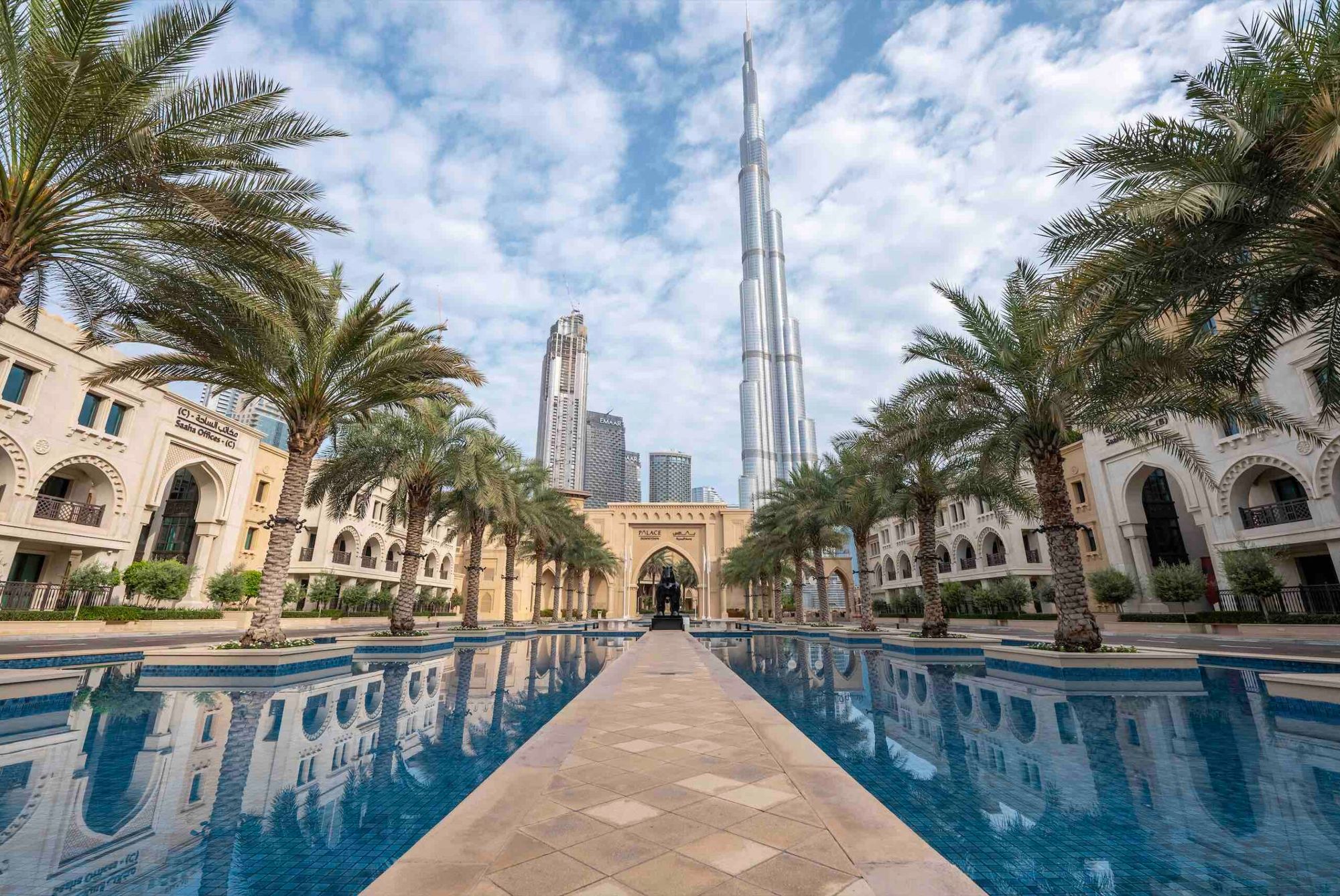 Palace Downtown is one of the most beautiful hotels in Dubai, and it offers an amazing view over the Burj Khalifa. The pond is lined with palm trees and offers incredible views of the Burj Khalifa that are hard to beat. One of the coolest features of the Palace Downtown Pond is a walkway that goes through the center and provides the perfect dramatic photo opportunity!