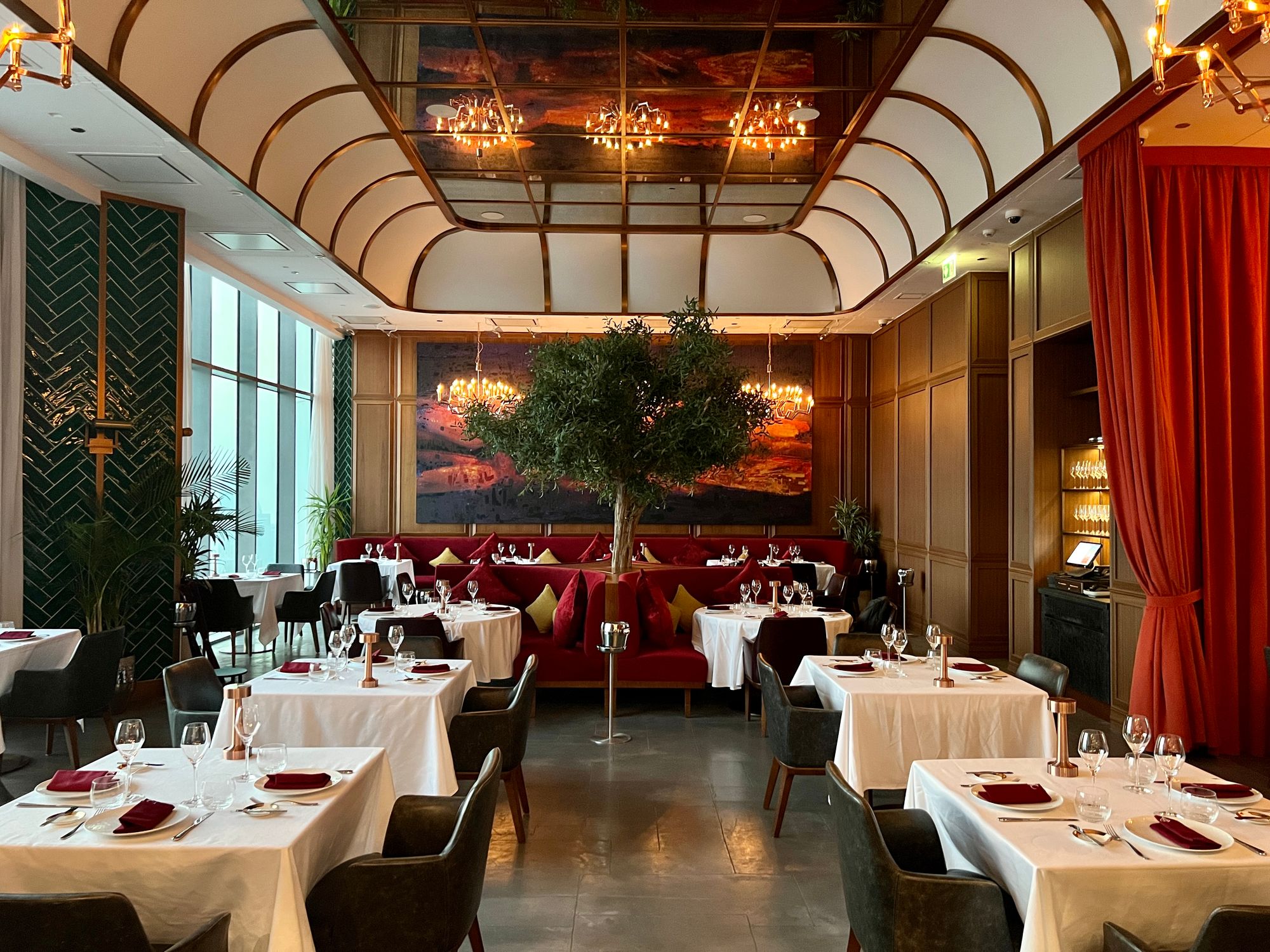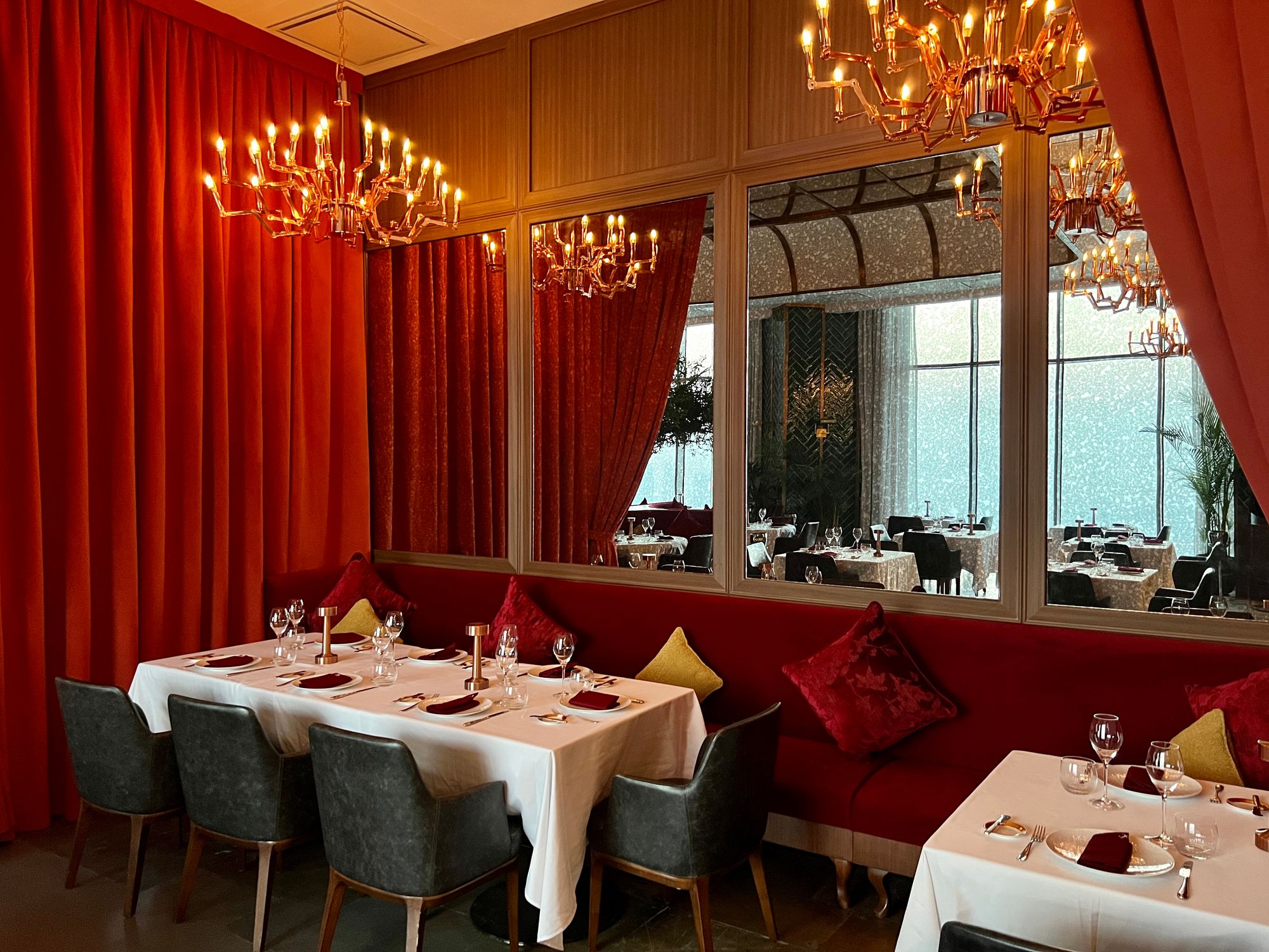 Setting the stage for an unforgettable dining experience, Carna now welcomes guests with visually captivating interiors, combining refined Art Deco finishings reminiscent of Gilded Age glamour with plush crimson-red seating and rich wood accent panels. Contemporary designs are realized with beautiful mirrors adorning the halls and the grand ceiling, drawing guests in, enhancing the overall ambience, and creating an atmosphere that is both sophisticated and inviting.