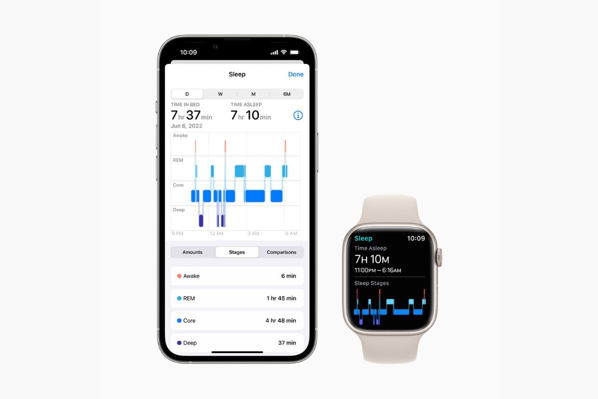 The Sleep experience on Apple Watch already empowers users to create Wind Down and Bedtime schedules, as well as track their sleep to help them meet their goals. Sleep tracking in watchOS 9 provides even more insights with the introduction of sleep stages. Using signals from the accelerometer and heart rate sensor, Apple Watch can detect when users are in REM, Core, or Deep sleep. Users will see sleep stage data on Apple Watch in the Sleep app and can view more detailed information, like time asleep, alongside additional metrics, like heart rate and respiratory rate, in sleep comparison charts in the Health app on iPhone.