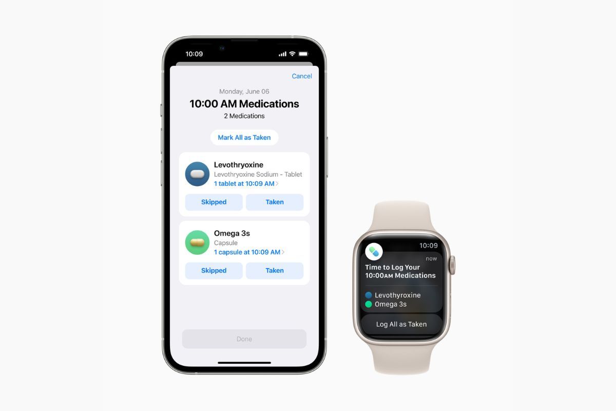The new Medications experience on Apple Watch and iPhone helps users manage and track their medications, vitamins, and supplements, allowing them to create a medications list, set up schedules and reminders, and view information on their medications in the Health app. The Medications app on Apple Watch makes it easy for users to conveniently and discreetly track medications anytime, anywhere.