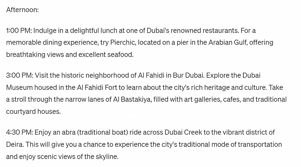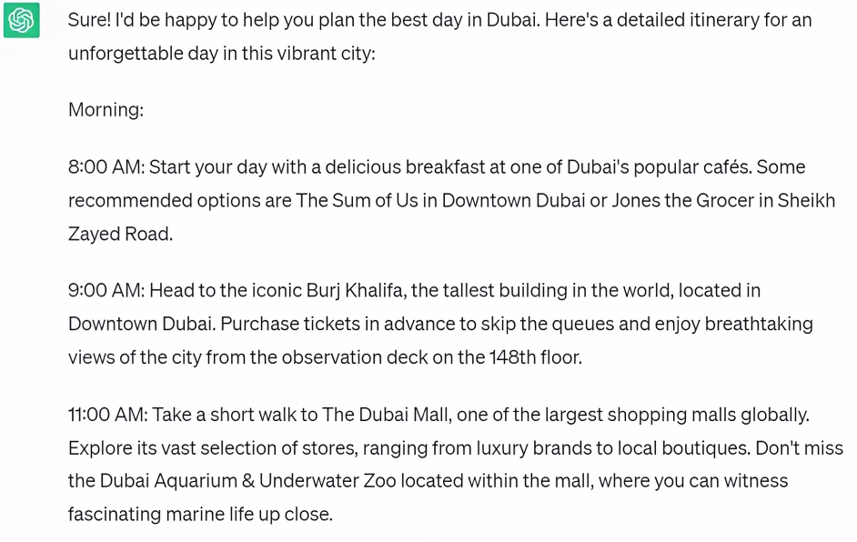 Since Chat GPT’s knowledge has a cut-off of till September 2021, and given how quickly the Dubaiscape changes. It can get a little difficult to plan your day using ChatGPT’s help as it wont be able to suggest you the newest and trendy things around the city and at times even recommends spots that are now closed. Which is why, we came up with our own itinerary to spend the best day in Dubai 2023.